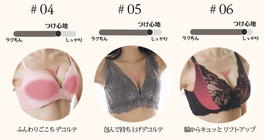そこで、着用感を、「ラクちん」から「しっかり」まで6段階に設定し、“ワイヤー入りブラジャーのようなしっかりした着用感”や、“すっぽりと胸を包み込むような安定した着用感”など、お客様が求める着用感で商品を選べるような商品を開発。