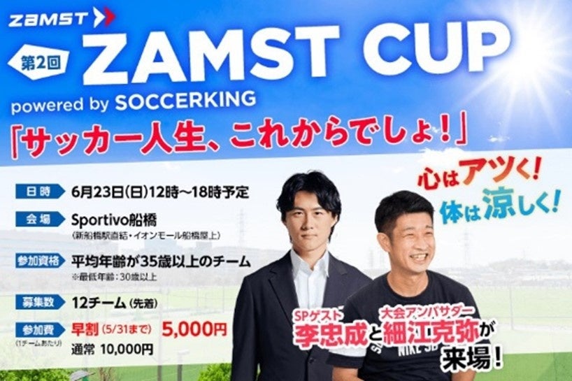 スポーツ向けサポート・ケア製品ブランド「ZAMST(ザムスト)」を展開する、日本シグマックス株式会社(本社:東京都新宿区、代表取締役社長:鈴木 洋輔)は、2024年6月23日(日)にOVER-35(平均年齢35歳以上)を対象にしたフットサル大会『第2回ZAMST CUP powered by SOCCERKING』をサッカーキングとともに開催いたします。