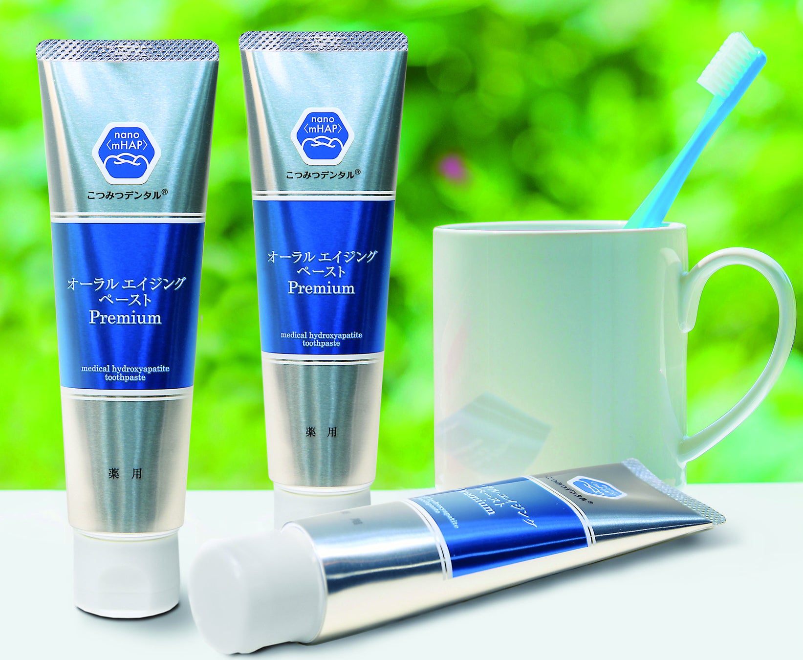 「こつみつデンタル」は、家族全員でお使いいただける薬用歯みがきです。6種類の有効成分を配合し、むし歯や歯肉炎の予防などの効能効果を持ち、ブラッシングにより歯本来の白さを目指します。
