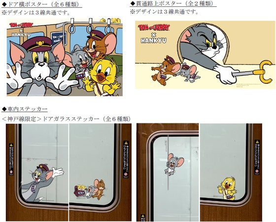 ラッピング列車「トムとジェリー号」には、車体に阪急沿線各地におでかけするトムとジェリーたちのデザインを施すほか、オリジナルヘッドマークを掲出し、マルーンカラーの制服を着たトムとジェリーたちのぬいぐるみが乗務員室に添乗します。車内にもポスターやステッカーを掲出し、「トムとジェリー」の世界観を演出しました。