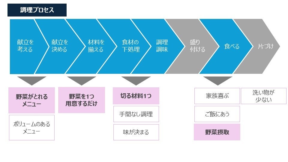 一般的な調理プロセスをみていくと、献立を考え、決定、喫食、片付けまで細かな調理プロセスにわかれています。野菜1つシリーズの魅力は、この細かな調理プロセスを大幅に減らすことができることにあります。