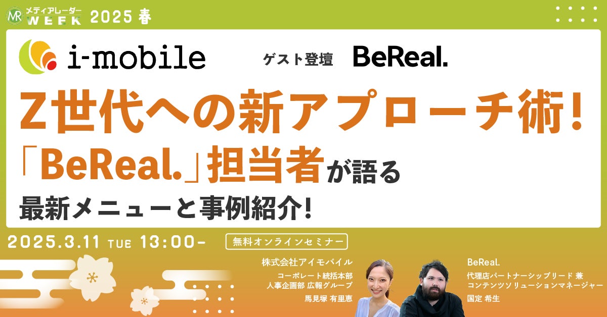 株式会社アイズ(所在地:東京都渋谷区、代表取締役社長:福島範幸、東証グロース:5242)が運営するNo.1*の広告業界のプラットフォーム「メディアレーダー」が主催するマーケティングセミナーイベント「第17回メディアレーダーWEEK 2025 春」にて、株式会社アイモバイル様が3/11(火)に登壇します。視聴申し込みは無料です。