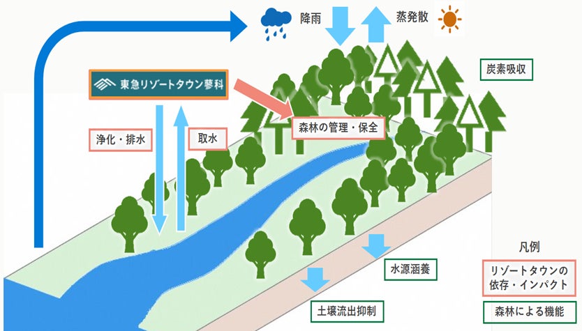 東急リゾートタウン蓼科の分析の中で、森林の多面的機能を取り上げており、TNFDレポート(第3版)では炭素吸収機能を分析しています。同時に、森林は水源涵養および水資源の供給、土砂災害防止など、環境だけでなく社会にポジティブな効果を発揮する多面的機能を有しています。