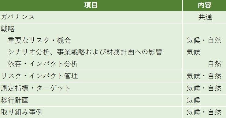 TNFDの開示枠組みは、環境関連の情報開示で先行し現在では標準化したTCFDの枠組みと合致しており、ISSB(国際サステナビリティ基準審議会)でも同様の枠組みが踏襲されるなど、気候関連課題と自然関連課題の統合的な開示が推奨されています。また、脱炭素社会への移行計画は、TCFDを中心にガイドラインが整備されていることから、その開示項目の一部が重複しています。加えて、気候と自然は密接に関係しており、投資家等の読み手のより深い理解の促進も求められています。