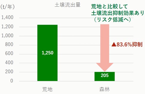 分析の結果、森林が維持される場合には、東急リゾートタウン蓼科における土壌流出量は年間約205tである一方、仮に、森林が荒廃し裸地となった場合には、年間1,250tまで土壌流出量が増加することが分かりました。