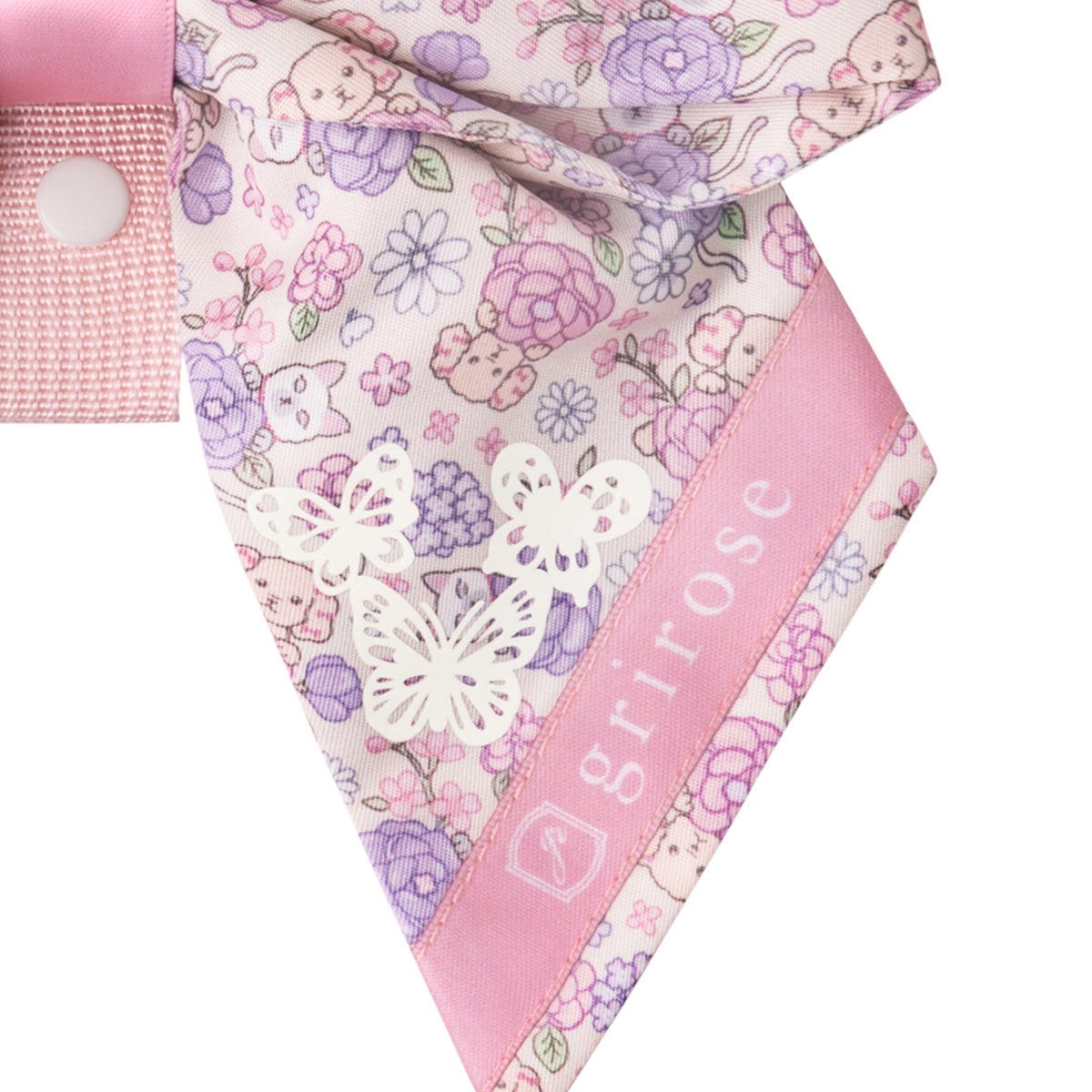 griroseの可愛い仲間、猫のペルルと犬のボンボンを柄に配した、「ランドセルリボン リトルフレンズ」。アイボリーとブルーの生地には、いろいろなお花と一緒にペルルとボンボンを散りばめました。暗い所で光が当たるとオーロラカラーに輝く、チョウの絵柄の反射材付きです。