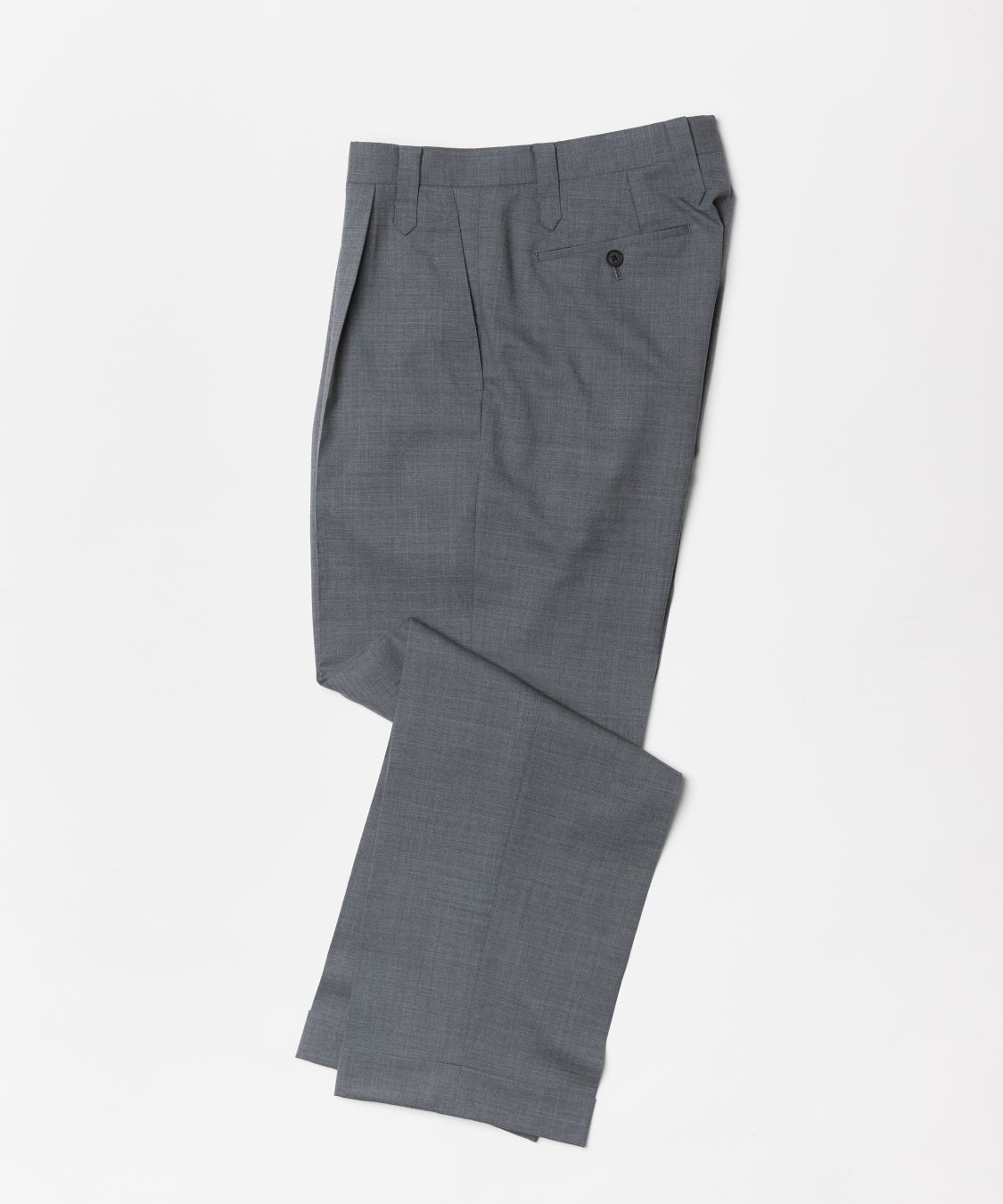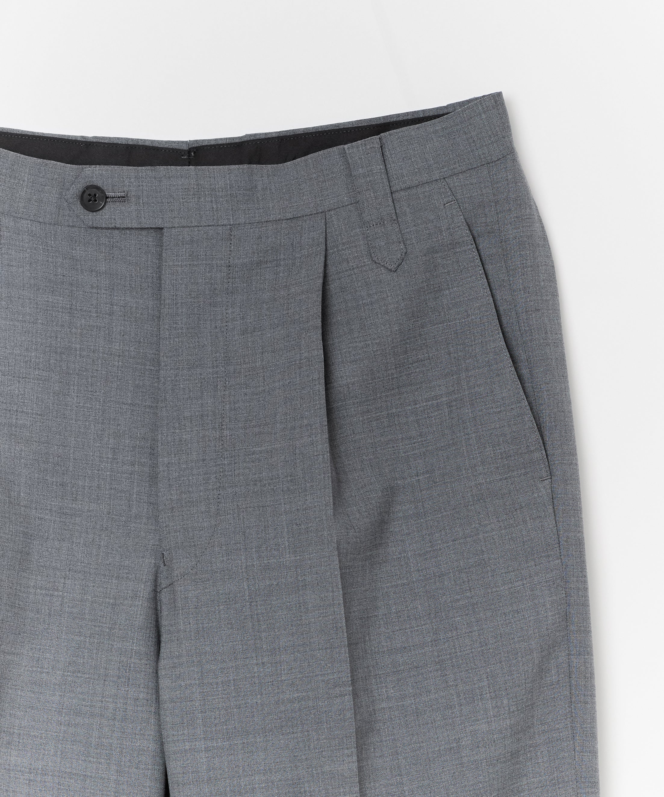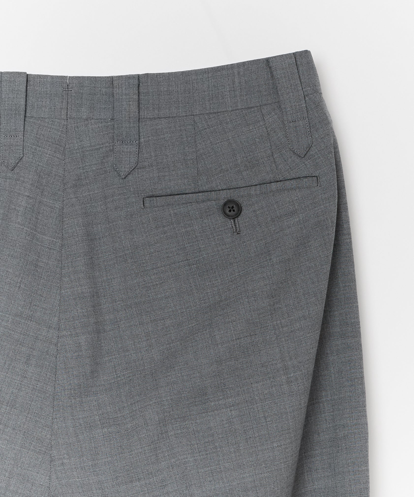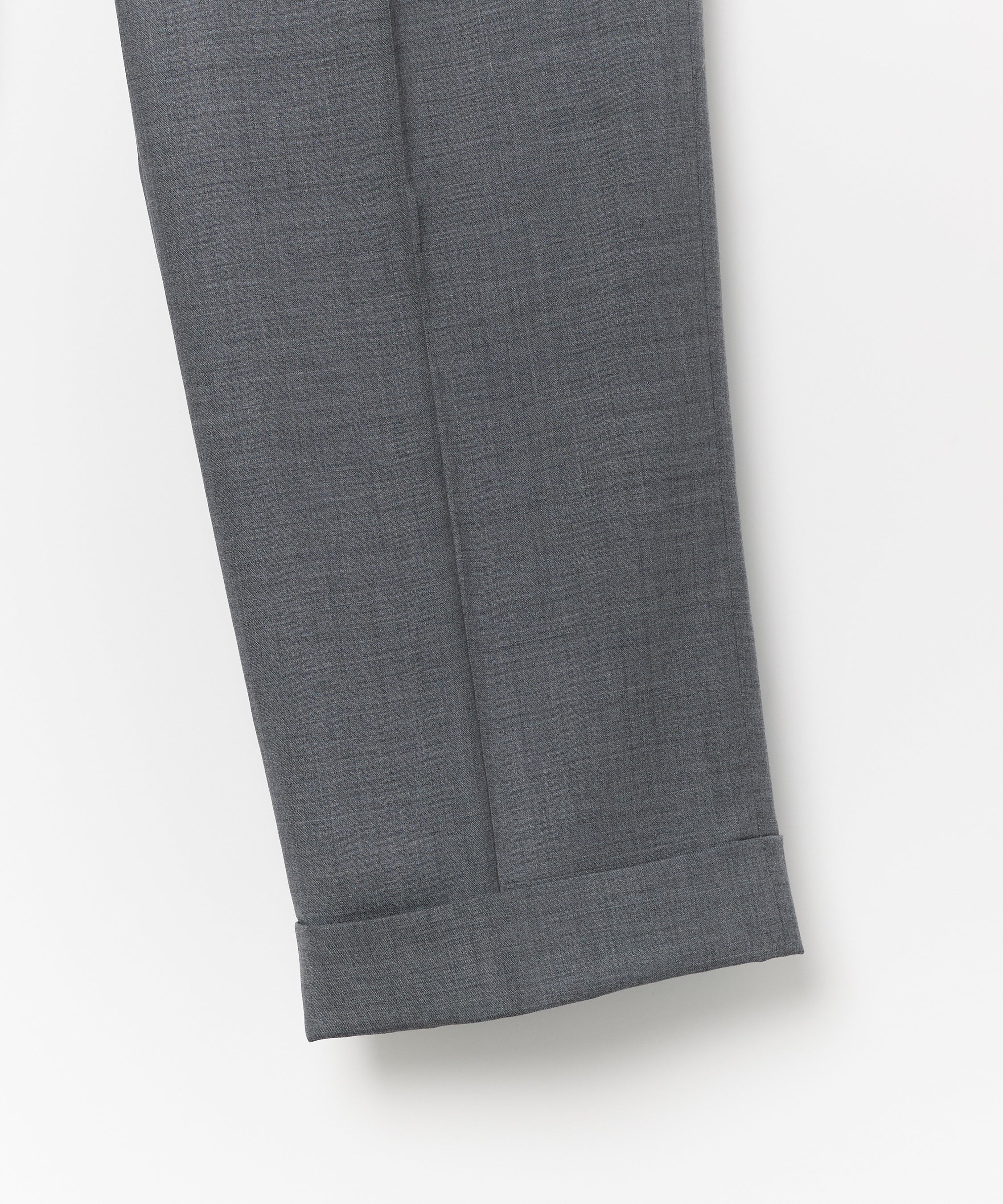72番手双糸のトロピカル生地。素材はウール100%でSuper100’sの原料を使用しているため、上質感と実用性を兼ね備えています。柔らかい風合いで肌あたりが良く、快適な穿き心地を提供してくれる生地です。目付は230g/mと春夏秋とロングシーズン着用できるウェイトをセレクト。生地の落ち感も良く、ドレスワイドパンツの優雅なシルエットを存分にお楽しみいただけます。
