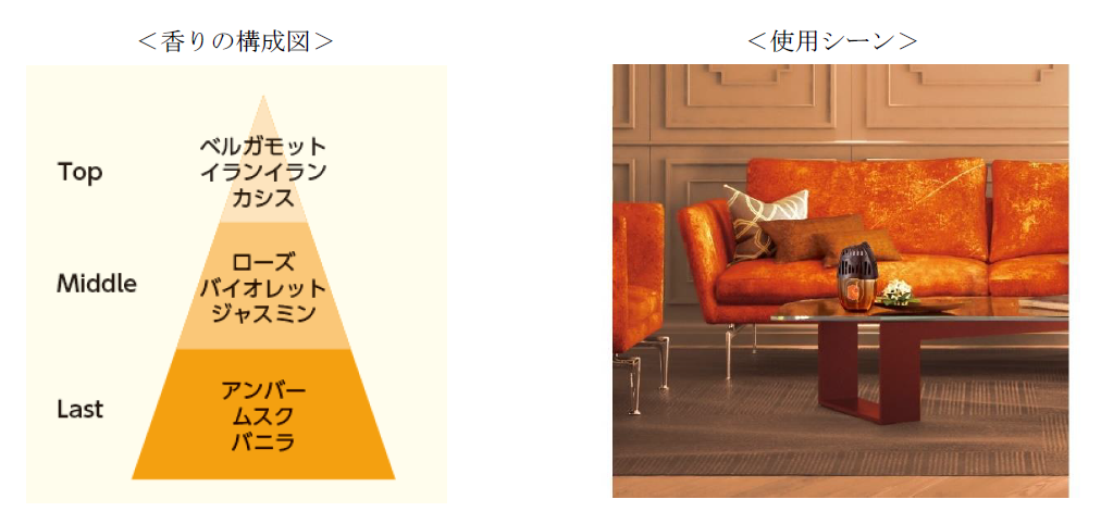 香りは、都会的で洗練されたインテリアをイメージしたエレガントフローラルの香りの〈アーバンリュクス〉と都会的で高級感のあるインテリアをイメージしたオリエンタルフローラルの香りの〈ベルベットムスク〉です。