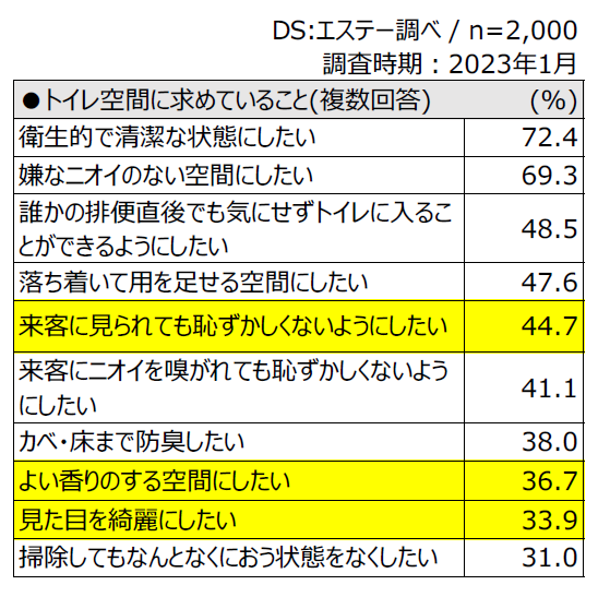 近年、トイレ空間は玄関やリビングのようなインテリア性の高い空間へと変化してきています。「トイレ空間に求めていること(複数回答)」をテーマに消費者意識を調査すると、“来客に見られても恥ずかしくないようにしたい(44.7%)”、“よい香りのする空間にしたい(36.7%)”、“見た目を綺麗にしたい(33.9%)”といったインテリア性や香りに対する意識が浮かび上がりました。