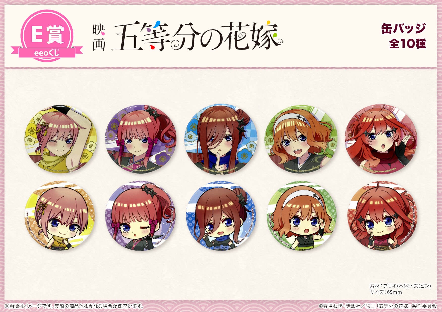 Wチャンス賞は対象期間中に、「eeoくじ」をご購入いただいた方の中から抽選で一花、二乃、三玖、四葉、五月それぞれの缶バッジとアクリルキーホルダーのセットが当たります。