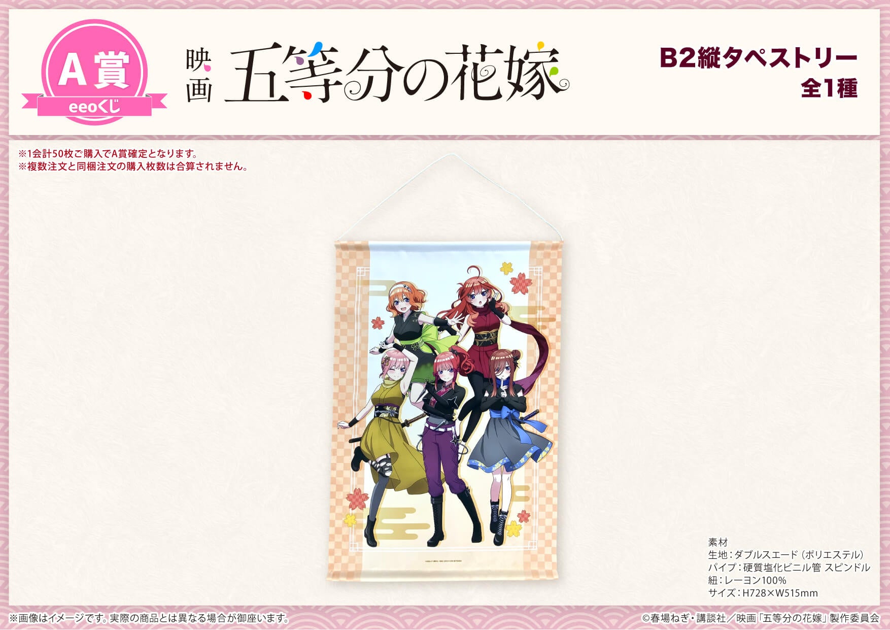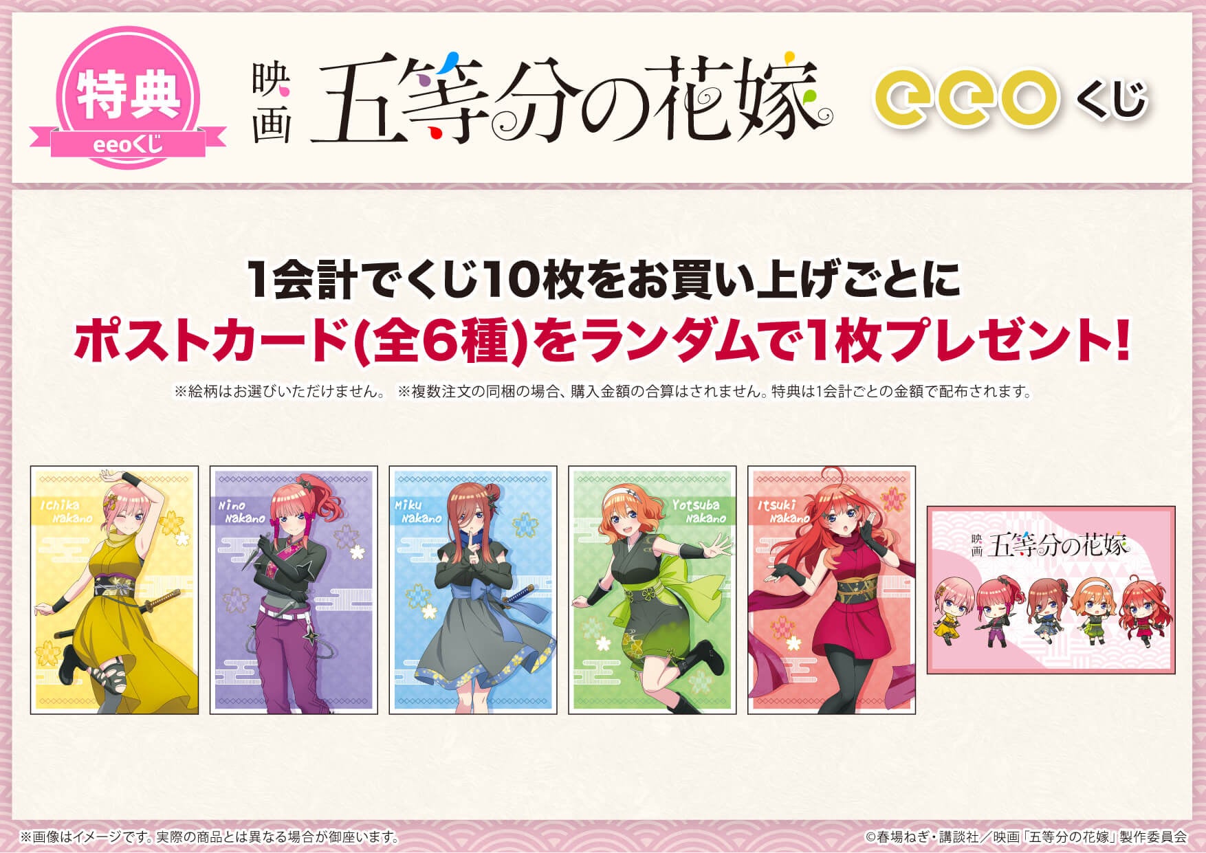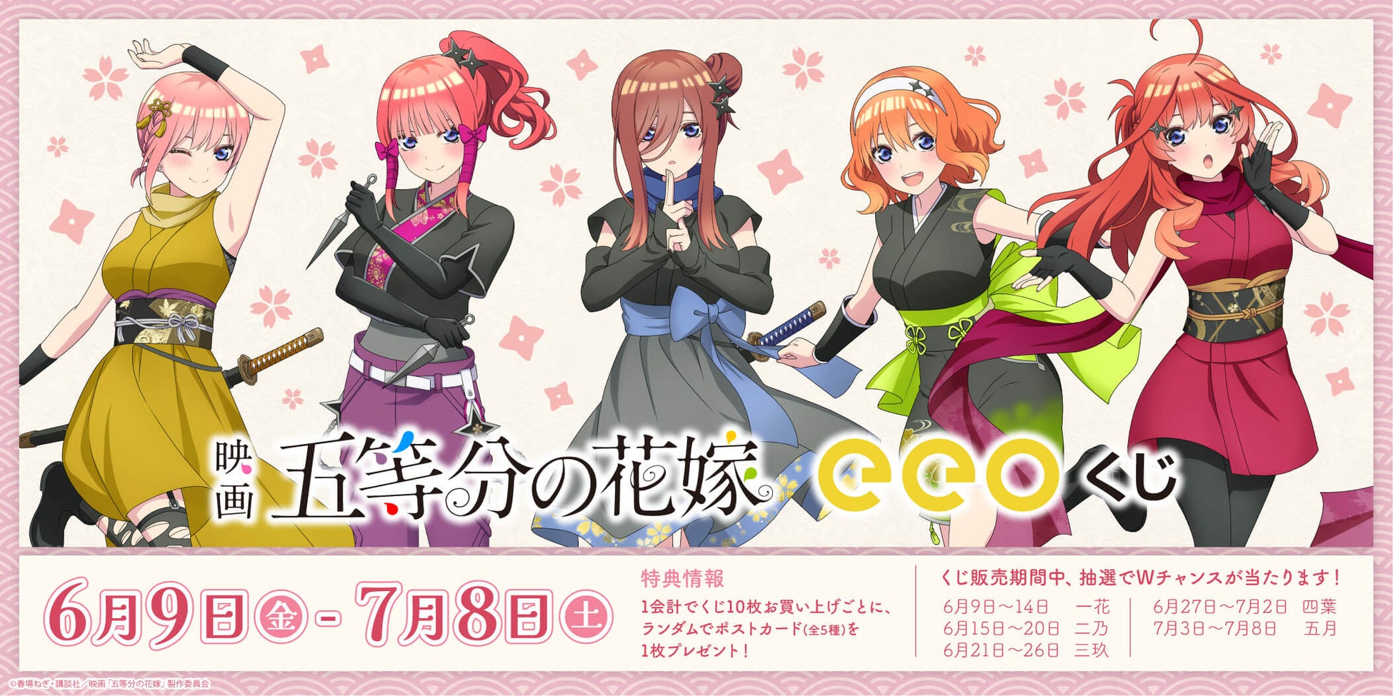 くノ一姿の五つ子の描き下ろしイラスト&ミニキャライラストを使って、豪華景品が登場した映画『五等分の花嫁』の「eeoくじ」。