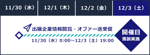 ※出展企業情報の閲覧・カジュアル面談オファーの送受信:11/30(水)~12/3(土)