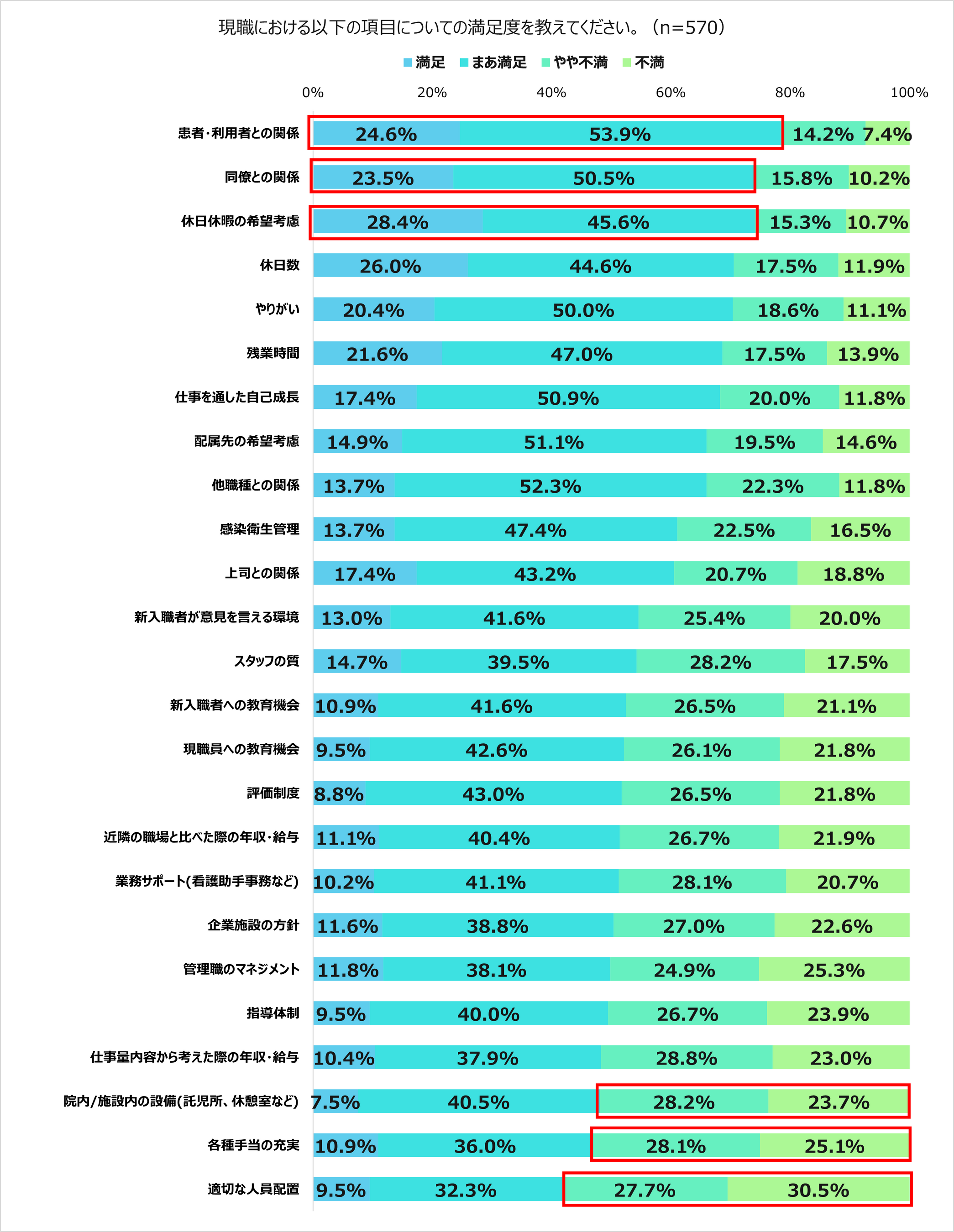 ・現職場での満足度が高いトップ3は「患者・利用者との関係(78.5%)」、「同僚との関係(74.0%)」、「休日休暇の希望考慮(74.0%)」