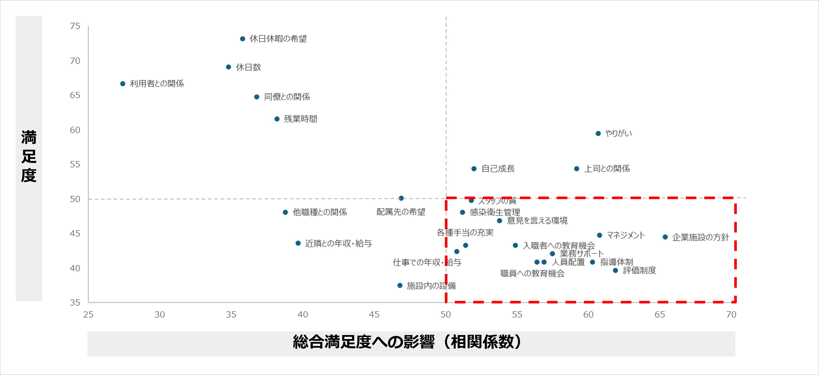 「企業施設の方針」、「評価制度」、「管理職のマネジメント」、「指導体制」については満足度が低く、総合満足度への影響は大きいため、重点的に改善すべき項目であることがわかった。