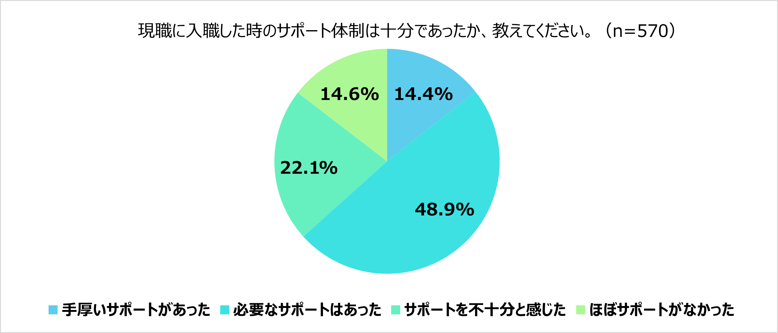 他方で、「サポートを不十分と感じた(22.1%)」と「ほぼサポートがなかった(14.6%)」を合わせると4割近くとなり、入職時のサポート体制については改善の余地がある。