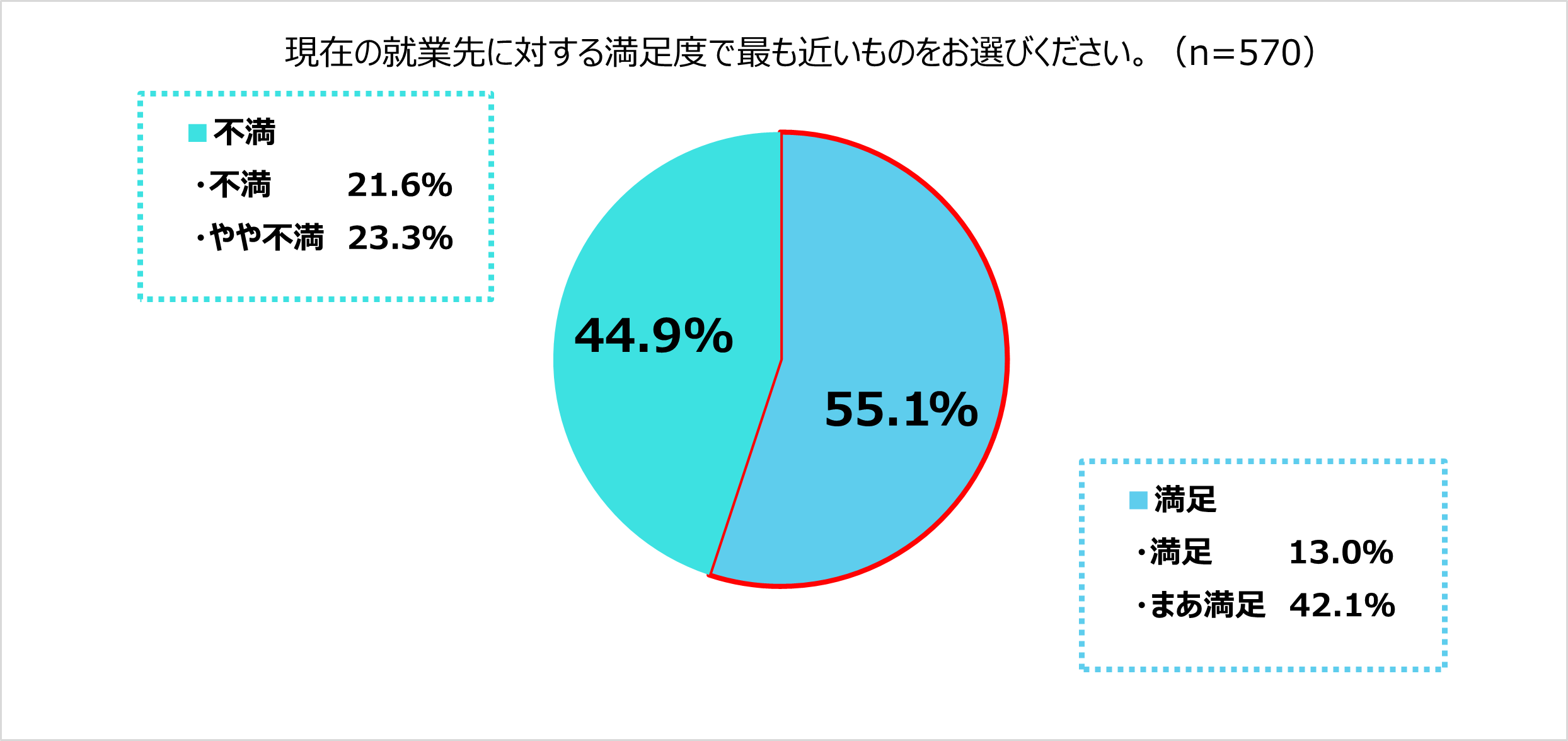 満足している層が多いものの、「まあ満足(42.1%)」が多く、「満足(13.0%)」と回答した人は、不満系である「不満(21.6%)」や「やや不満(23.3%)」を下回る結果となった。