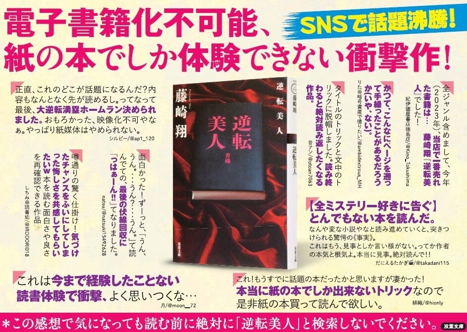 電子書籍不可!紙の本でしか体験できない伝説級トリック『逆転美人』が新帯で重版決定!