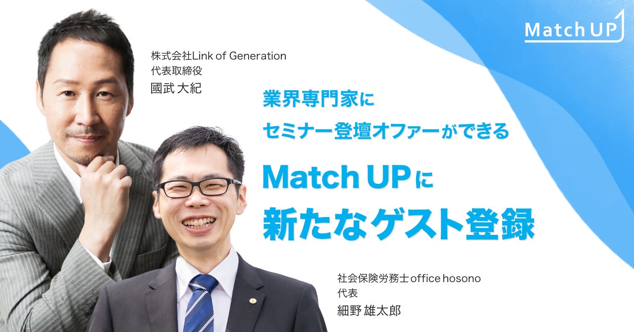 セミナー登壇オファーができる「Match UP」Link of Generation國武大紀氏、社会保険労務士office hosono細野雄太郎氏がゲスト登録