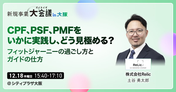 Relicは、創業以来一貫して大企業からスタートアップまで多岐にわたる新規事業の創出・推進を支援してまいりました。本イベントの各セッションでは、ディープテック、生成AI活用、PMF(Product Market Fit)実践、そして新規事業プレゼンの審査員が持つ評価視点といった、新規事業を取り巻く最先端のテーマについて、実践的な知見を提供します。