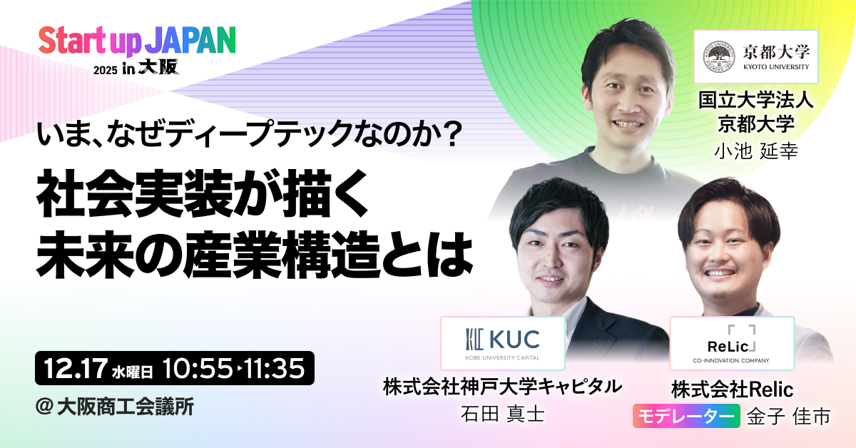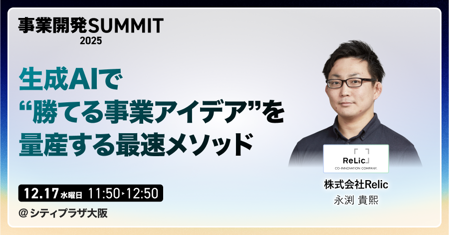 事業共創カンパニーである株式会社Relic(本社:東京都渋谷区、代表取締役CEO:北嶋貴朗、以下、Relic)は、2025年12月17日(水)・18日(木)の2日間にわたり、マイドームおおさかほか複数施設にて開催される日本最大級のスタートアップ展示会「Startup JAPAN EXPO 2025 in 大阪」(併催:新規事業 大会議 2025 in 大阪)へ取締役CROの大丸徹也を含む役員・マネージャー計5名が登壇することをお知らせします。