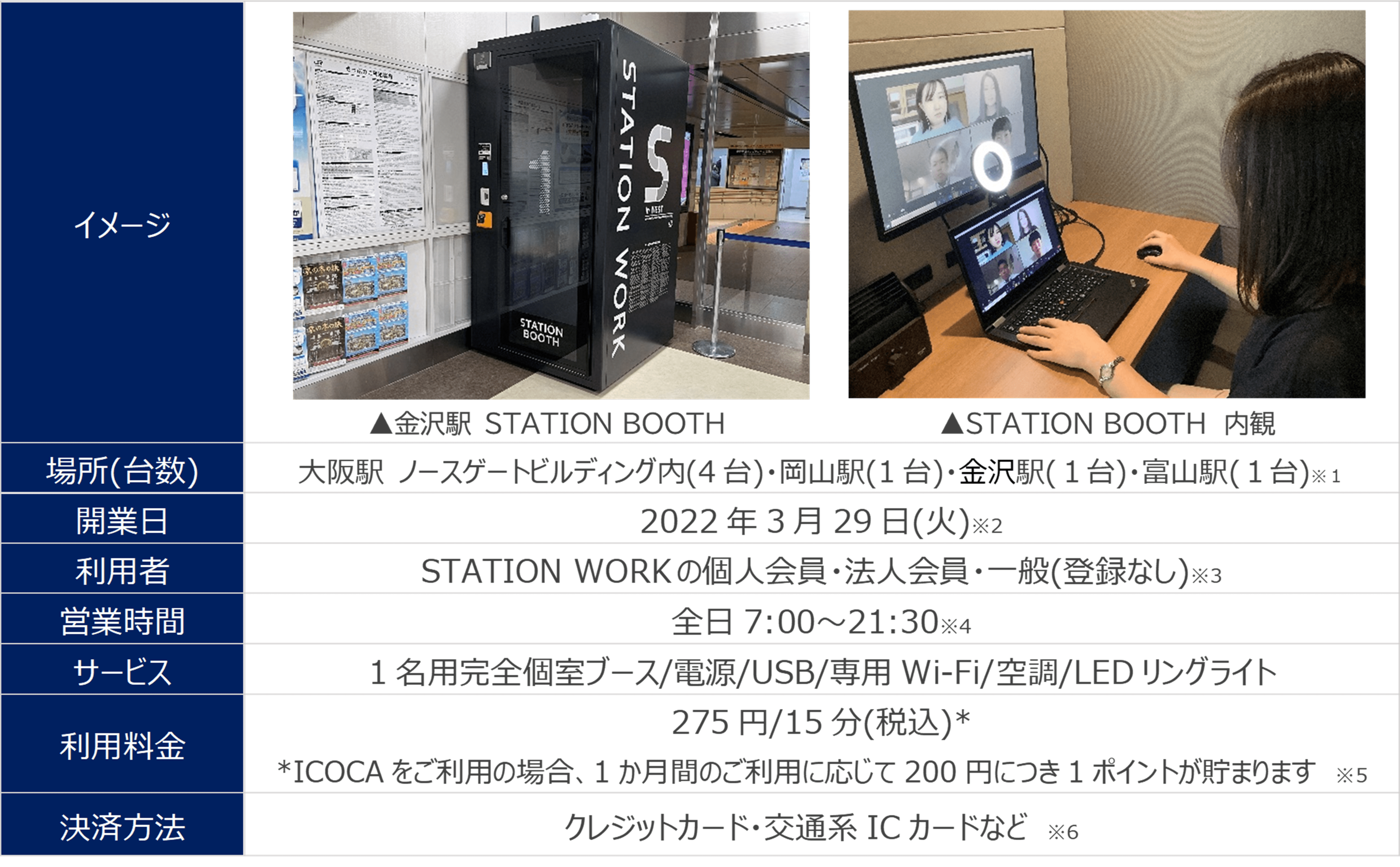 | ○東日本旅客鉄道株式会社(本社:東京都渋谷区、代表取締役社長:深澤 祐二/以下「JR東日本」)と西日本旅客鉄道株式会社(本社:大阪府大阪市、代表取締役社長:長谷川 一明/以下「JR 西日本」)は、西日本エリアにおけるテレワークやWEB会議といった多様な働き方をサポートするため、連携してワークプレイス戦略を展開します。 ○2022年3月29日(火)に、大阪駅(ノースゲートビルディング内)、岡山駅、金沢駅、富山駅の駅構内に1名用個室ブース「STATION BOOTH」を開業します。ICOCA電子マネーにも対応し、ご予約が入っていなければ、会員登録がなくてもご利用いただけます。 ○開業後のご利用状況を踏まえ、2022年度以降、JR西日本エリアの多くの駅への「STATION BOOTH」の展開を目指します。 |