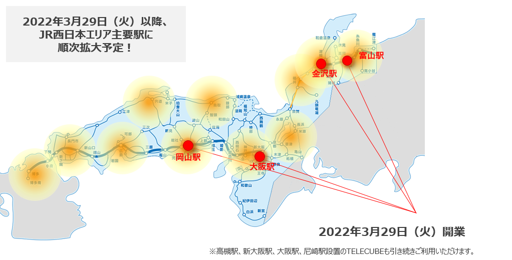 ○このたびの両社の提携により、各々の事業エリアにお住まいのお客さまに広範なテレワーク環境のご提供が可能となります。今後はJR西日本エリアの多くの駅への設置拡大を推進していくと共に、各々の事業エリアにおいて、お客さまのライフスタイルに欠かせないマチナカなどへの施設拡大も検討します。