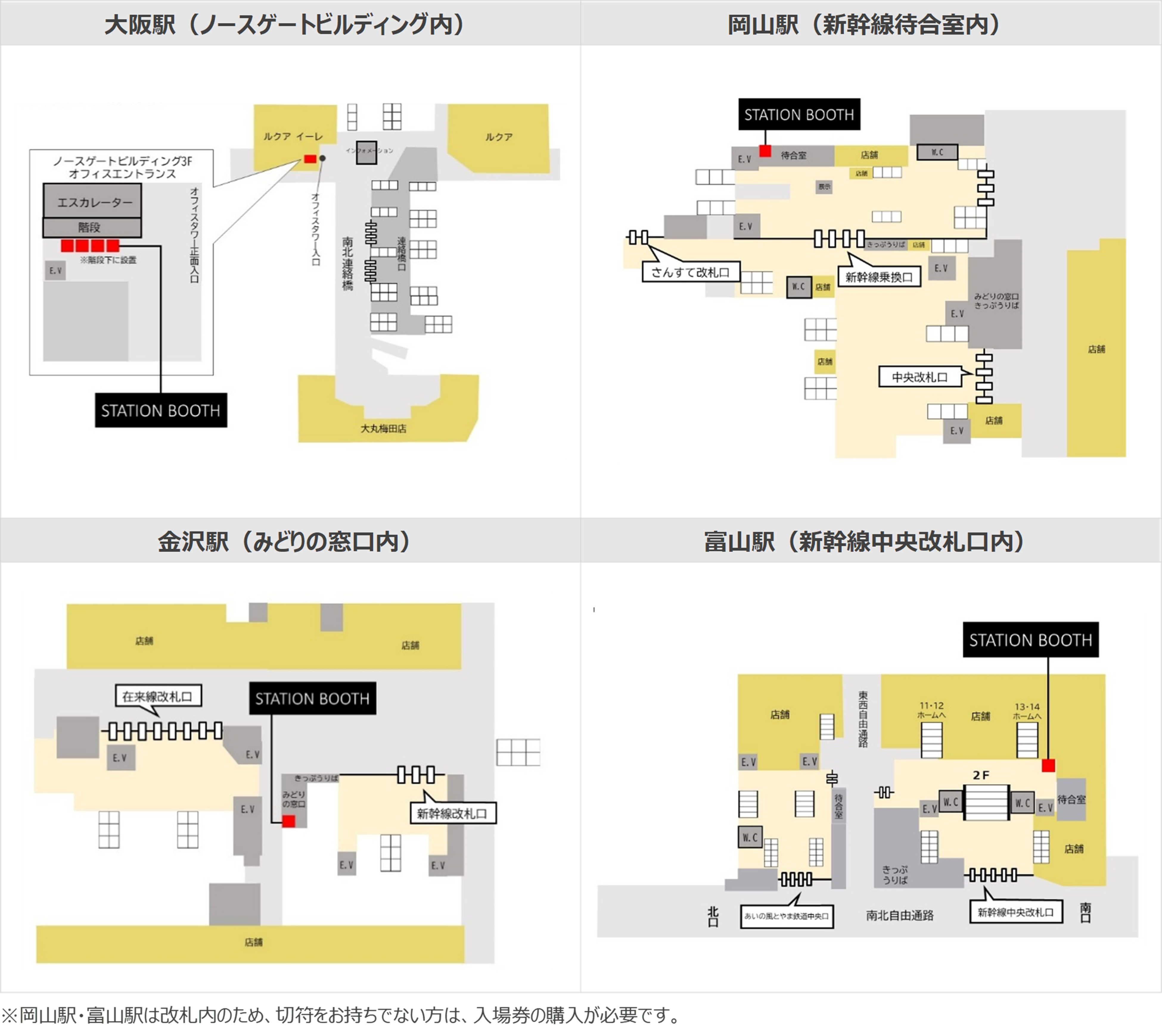 ※岡山駅・富山駅は改札内のため、切符をお持ちでない方は、入場券の購入が必要です。