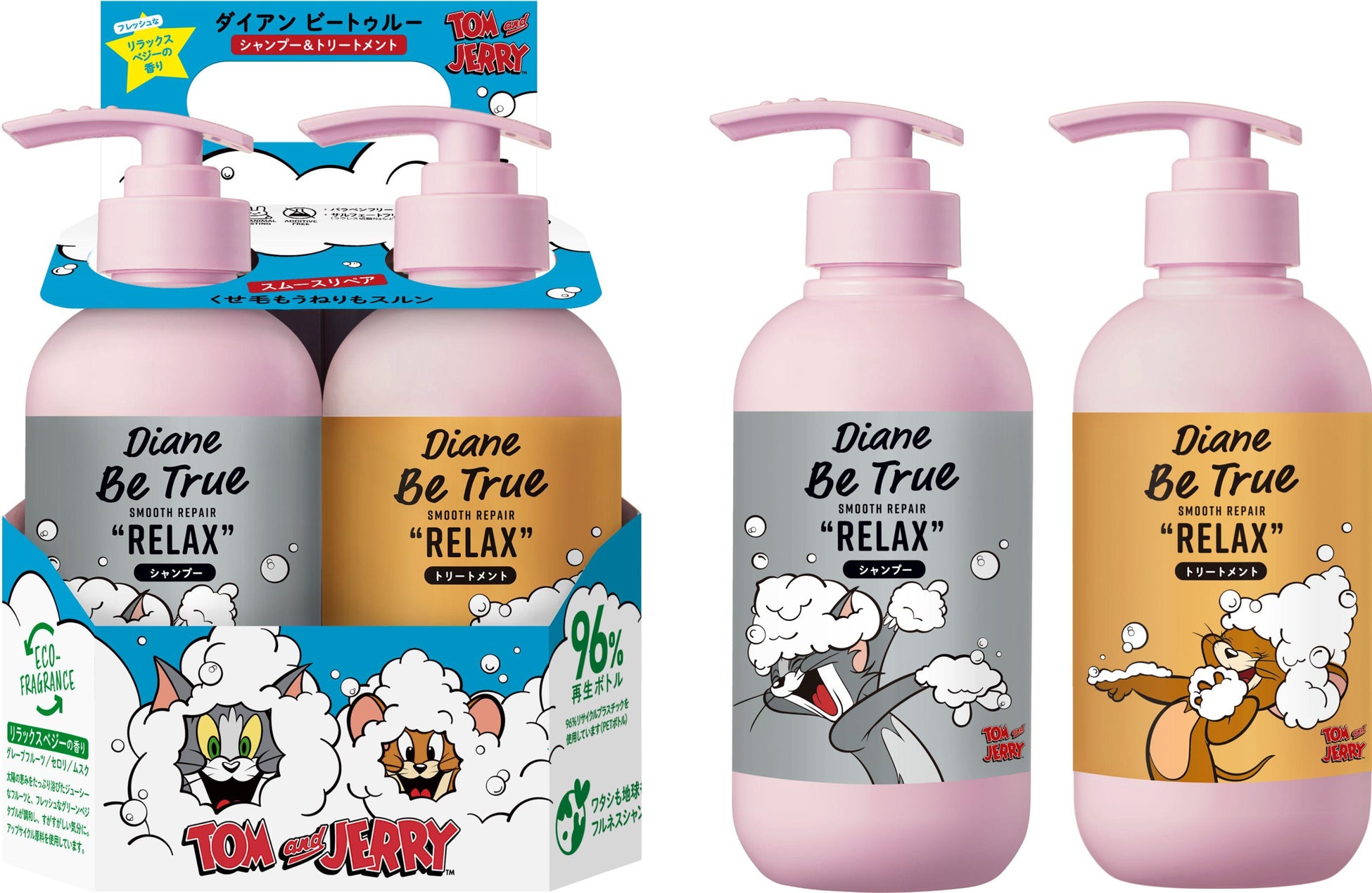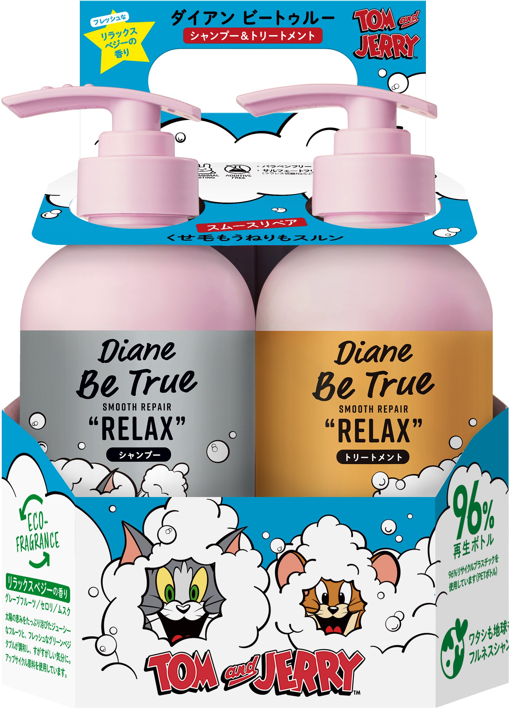 今回コラボレーションする「RELAX(リラックス)スムースリペア」のシャンプー&トリートメントセットでは、シャンプーにネコのトム、トリートメントにネズミのジェリーがチャーミングに描かれ、セットで合わせるとふたりが仲良くバスタイムを過ごしている様子が表現されています。バタバタするような忙しい毎日の中でも、トムとジェリーとともに、お風呂の中ではリラックスする時間を過ごしてみてはいかがでしょうか。
