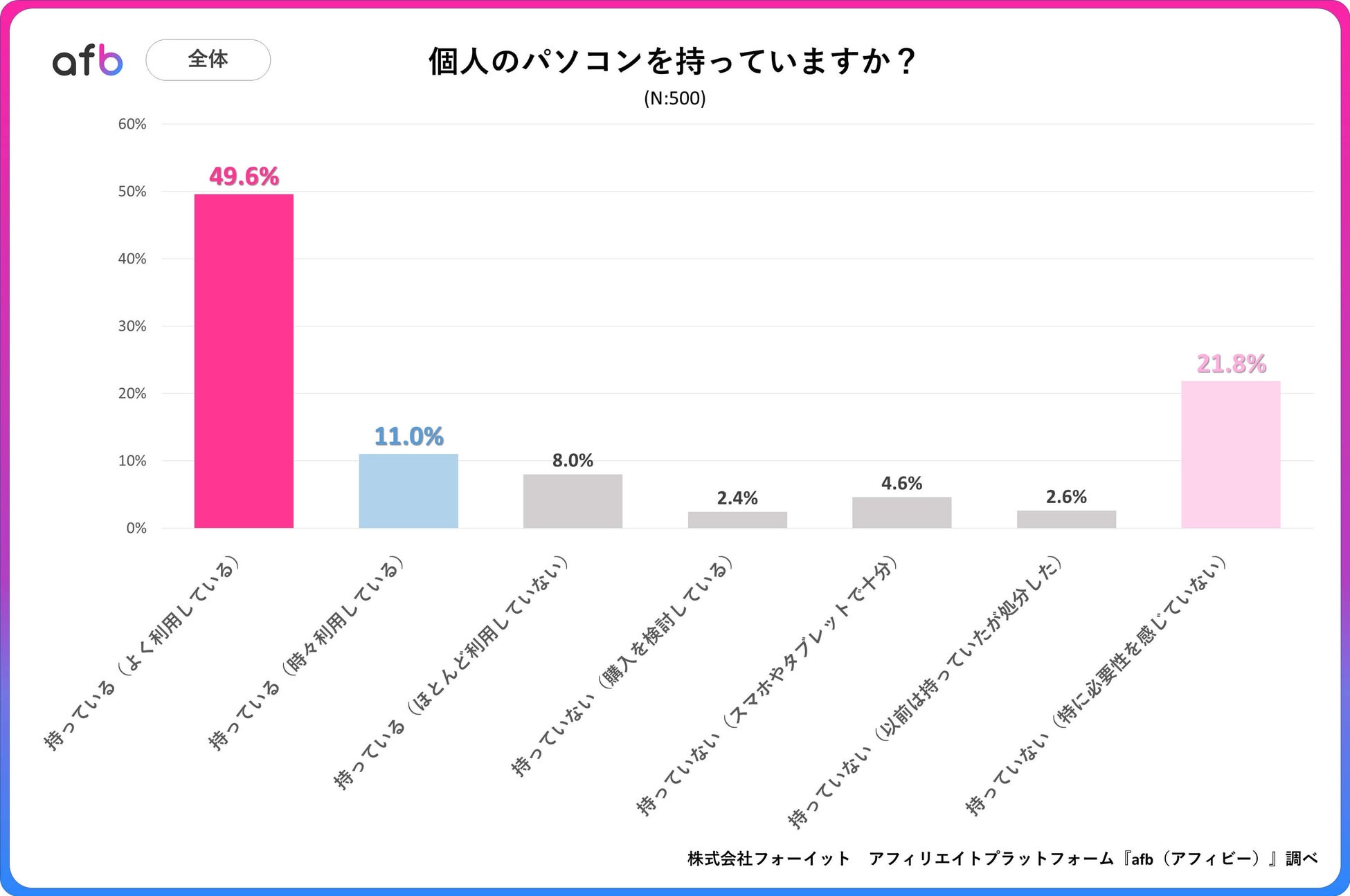 その内訳で最も多かったのは「持っている(よく利用している)」で49.6%でした。次いで、「持っていない(特に必要性を感じていない)」が21.8%、「持っている(時々利用している)」が11.0%で続くという結果になりました。