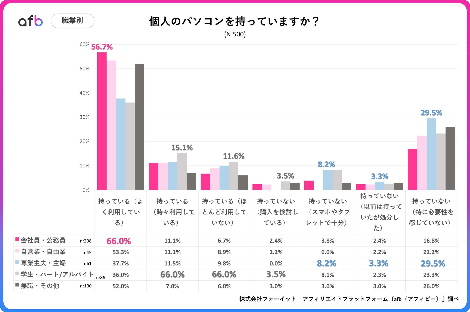 職業別PC保有率:「仕事で使う」層は高く、専業主夫・主婦は低い結果に