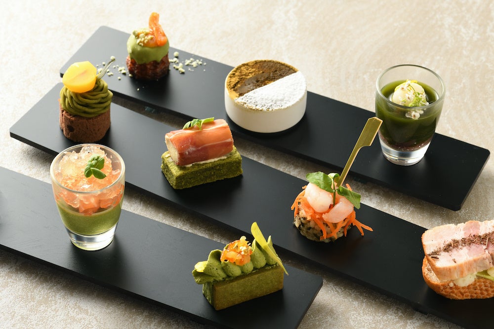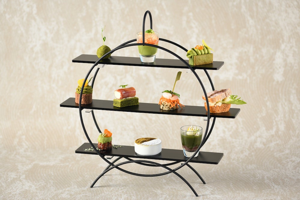 「フォワグラムースの苔玉」や「緑茶のスコーン 白味噌とクリームチーズの生ハム巻き」、「抹茶のカヌレ アプリコットソース」など、フレンチシェフが手掛けるアフタヌーンティーならではの食材の取り合わせが魅力です。