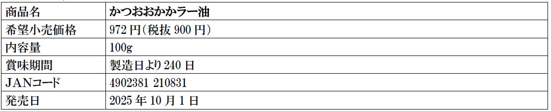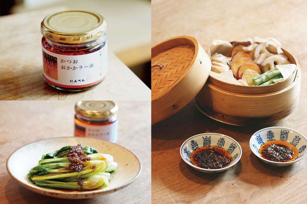 株式会社にんべん(東京都中央区、代表取締役社長 髙津伊兵衛)は、普段使いや贈り物にもぴったりな商品が揃う『NIHONBASHI』ブランドから、「かつおおかかラー油」を2025年10月1日(水)より「にんべん 日本橋本店」限定で新発売いたします。本商品は、昨年秋に発売し好評を得た「かつおおかかナッツ」のシリーズ商品です。醤油で薫り高く仕上げたジューシーなおかかと、乾燥玉ねぎ、フライドオニオンのうまみを愉しめる、程よい辛さが食欲をそそる唐辛子調味料です。料理の味付け、仕上げ等、幅広くご使用ください。