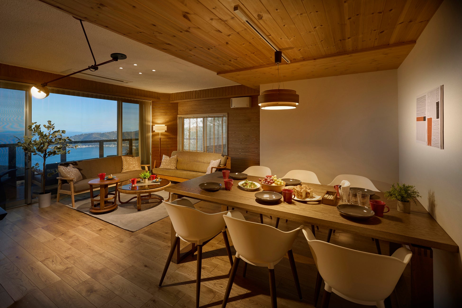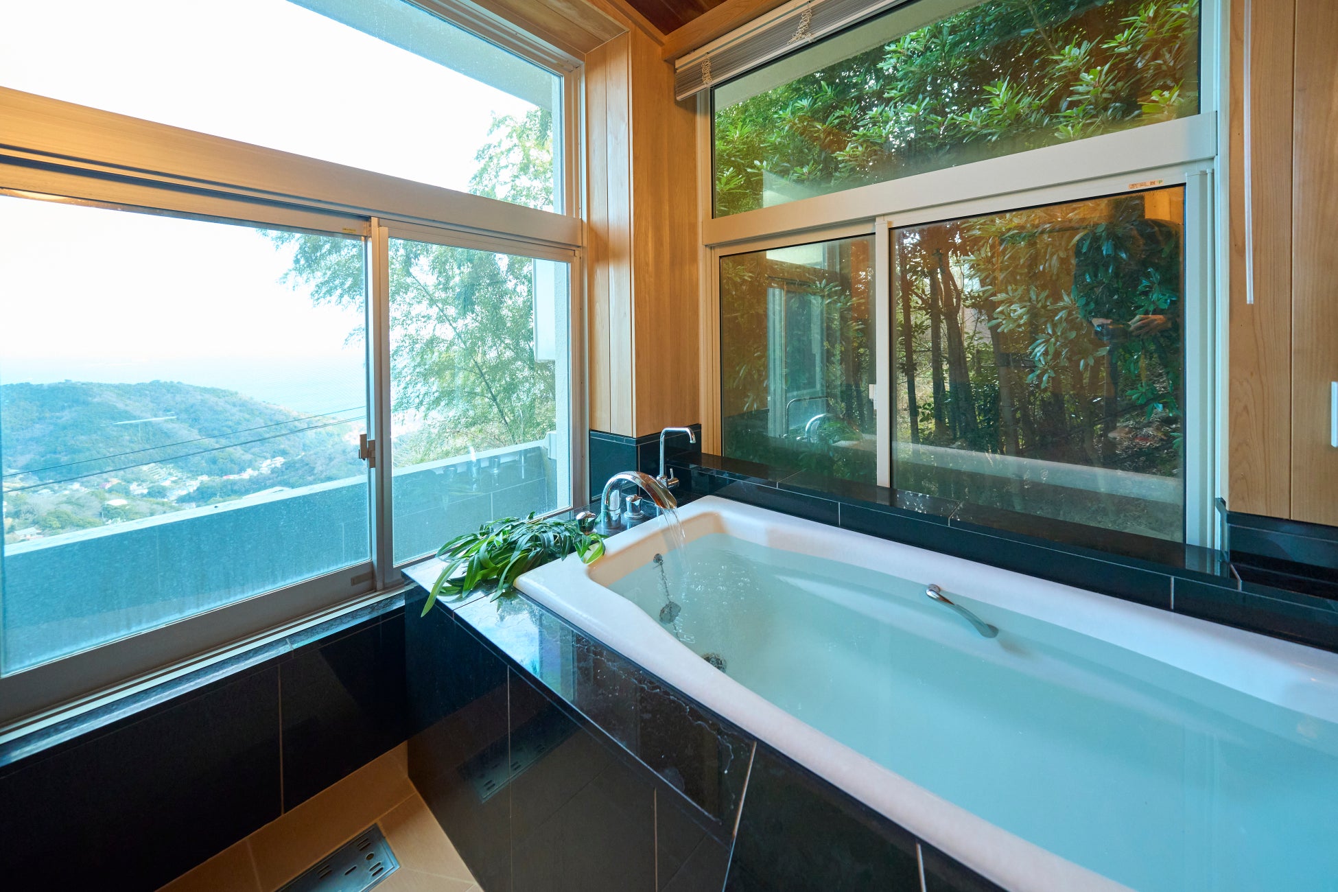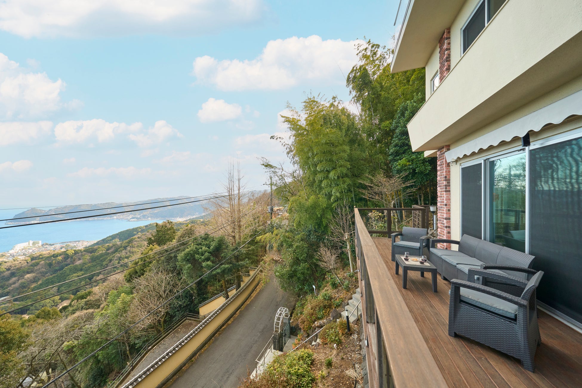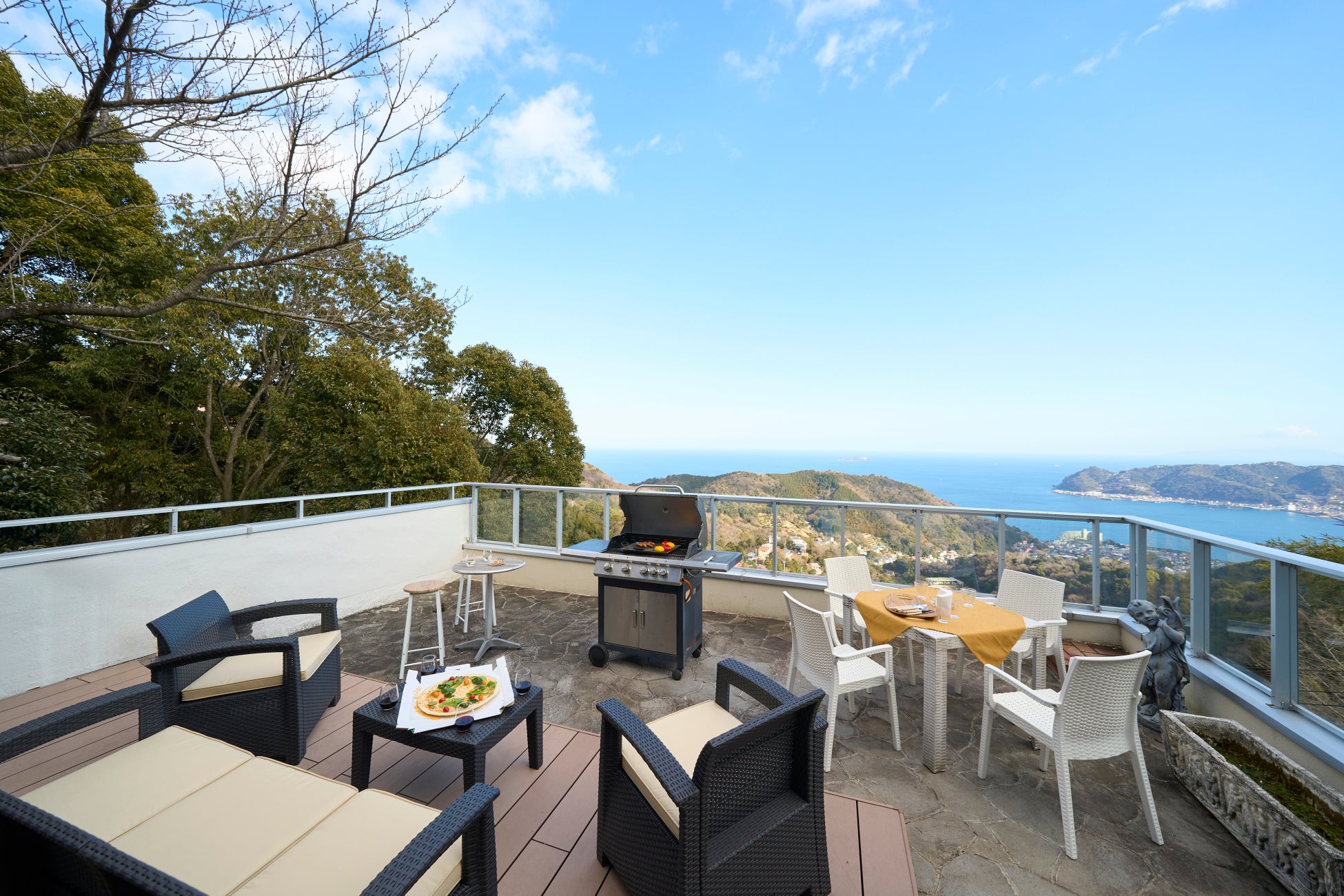 人気の別荘地「熱海自然郷」の高台に位置する大邸宅。1階と3階にあるテラスからは、駿河湾の大海原を一望できます。3階のテラスにはBBQグリルやガーデンファニチャーが設置されているので、BBQやティータイムをお楽しみいただけます。熱海温泉のお風呂で癒しの時間をおすごしください。