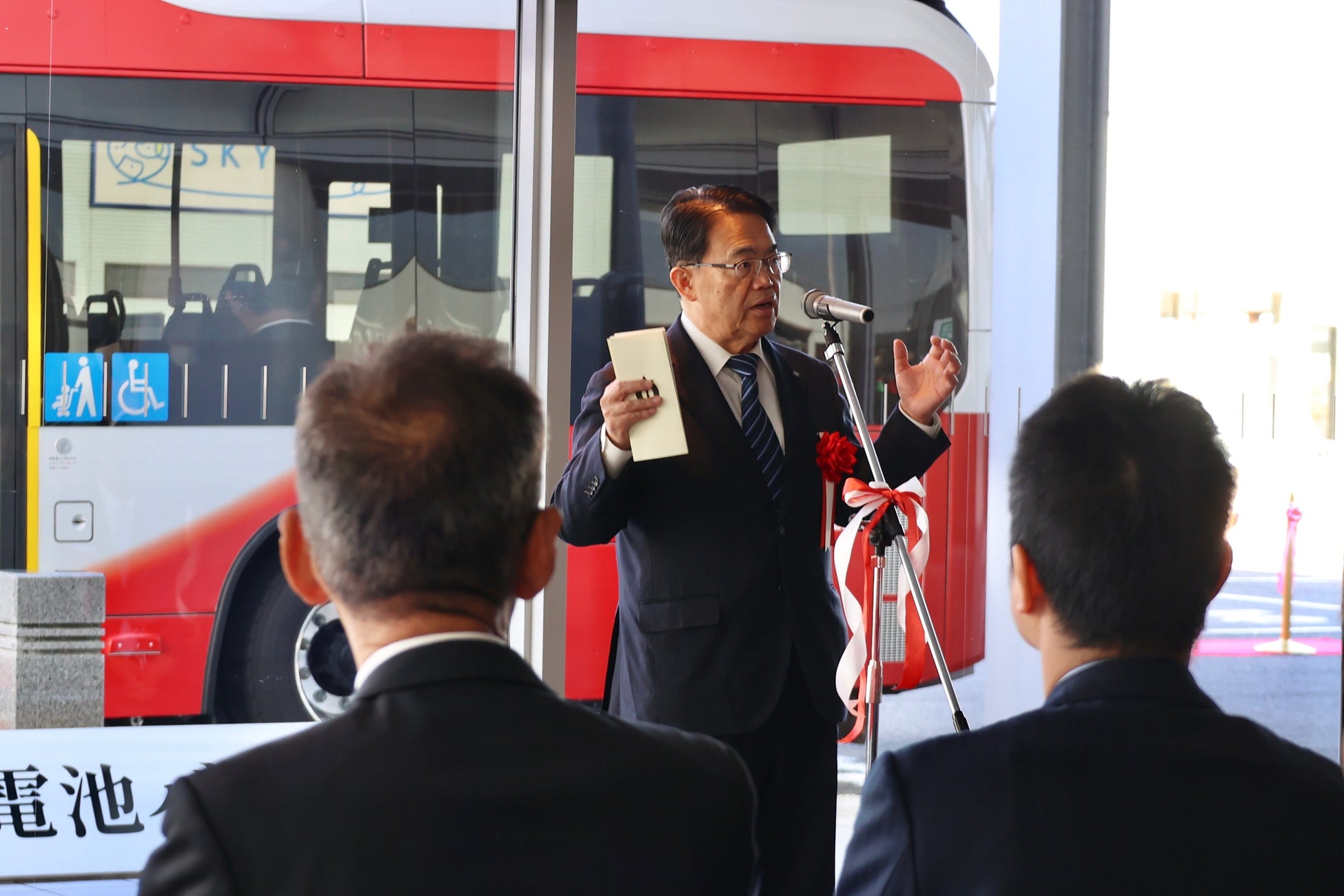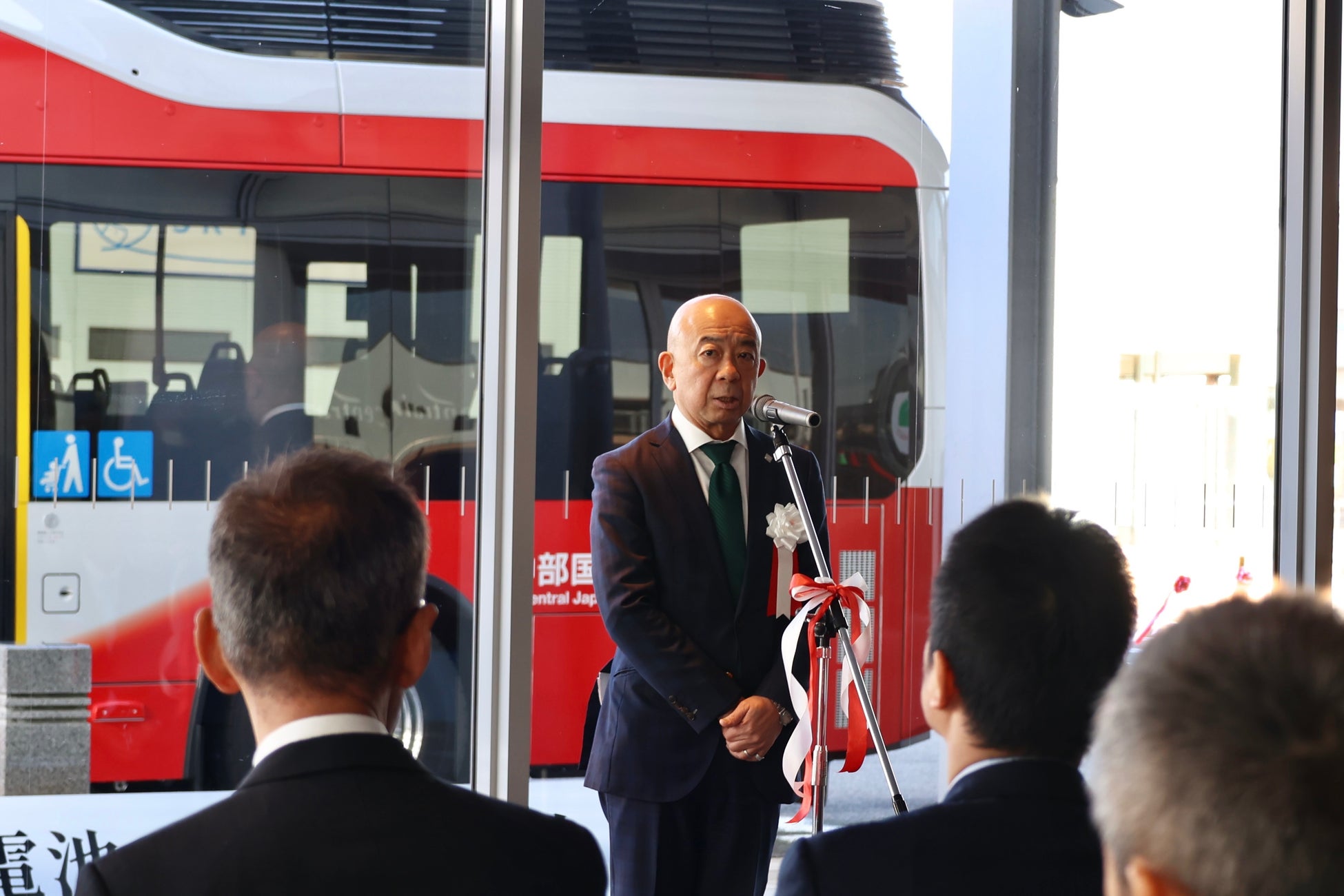 犬塚は、「セントレアは開港当初から環境に配慮した取り組みを行っており、2021年5月には『セントレア・ゼロカーボン2050宣言』を表明、2023年12月には『中部国際空港脱炭素化推進計画』が国に認定された。燃料電池バスは『中部国際空港脱炭素化推進計画』の一環で、本日からターミナル間連絡バスとして運行を開始する。現行のターミナル間連絡バス(ディーゼルバス)の利用者数は600人強/日であり、そのお客様に燃料電池バスをご利用いただくことで、お客様にも脱炭素化を担っていただくことにもなる。セントレアは今後もお客様とともに環境にやさしい、脱炭素化施策に取り組んでいきたい。」と、燃料電池バスの導入をはじめとし、今後の脱炭素化について語りました。