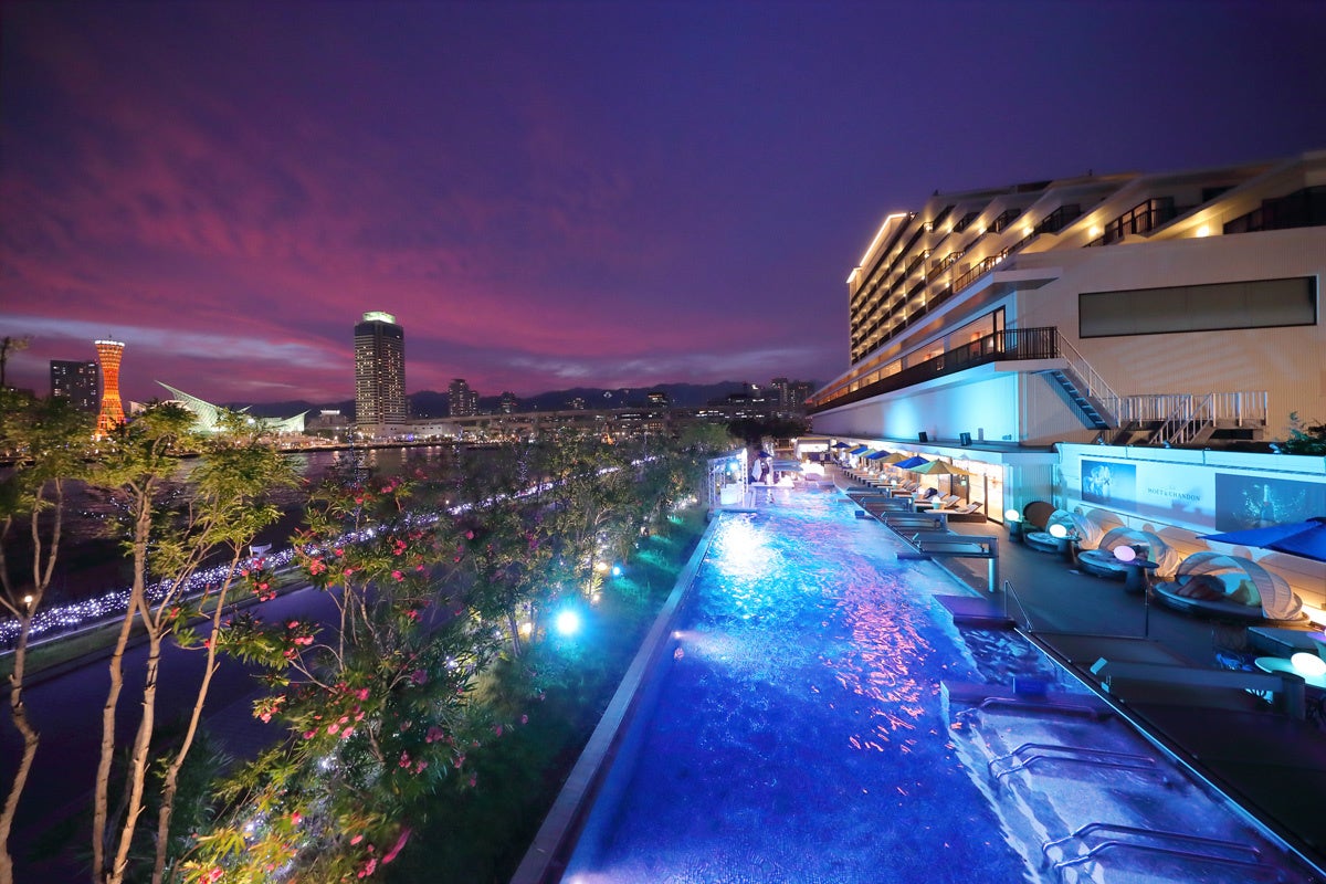 泡が噴き出すマッサージベッドや、半身浴をしながら移ろいゆく神戸港の景色が愉しめるアクアシートなど、絶景と光の都神戸の中心で、ここでしか体験できないリラックスしたひとときを過ごすことができる屋外温水プールです。