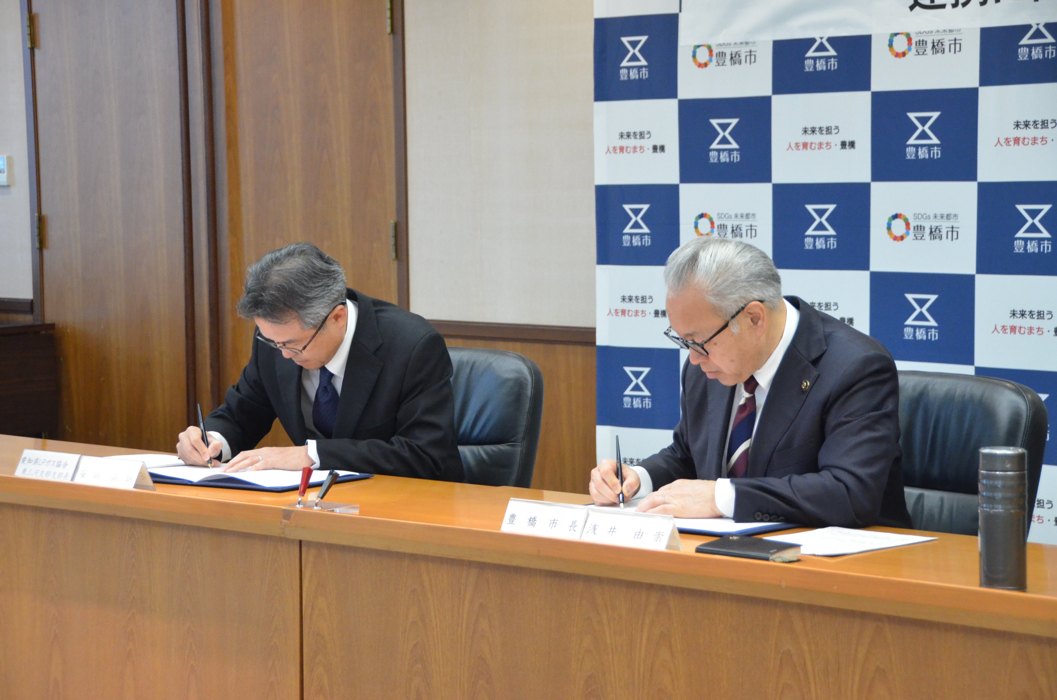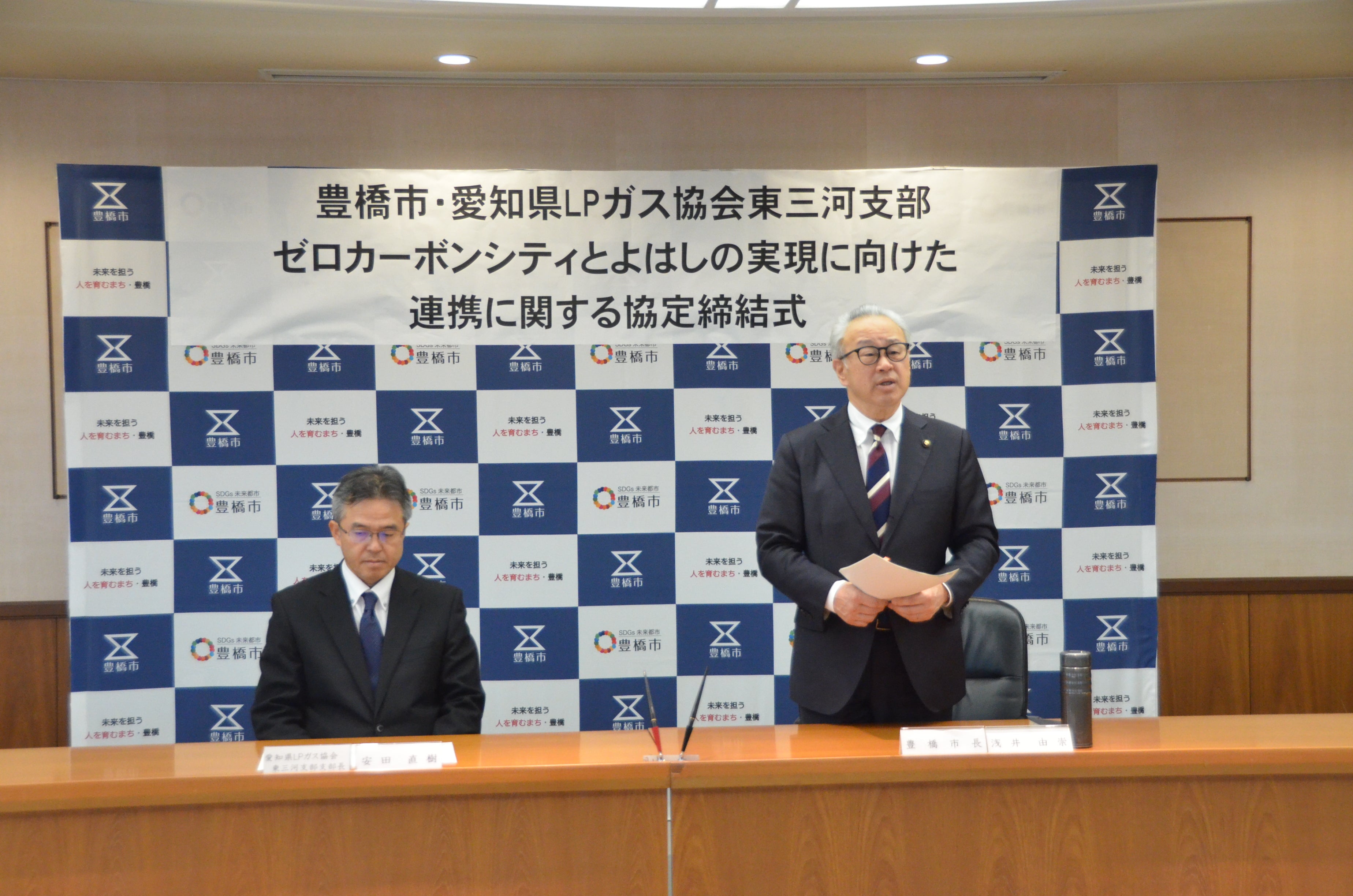 協定締結式は市役所で開かれ、浅井由崇市長と安田直樹支部長が協定書に調印しました。あいさつに立った浅井市長は、ゼロカーボンシティの実現には「市民、事業者の皆さんを巻き込んでいかないといけない」と述べた上で、「家庭や事業者の皆さんと密接な関係で仕事をしているLPガス業界の皆さんにPRしていただけるのは、説得力があります」と期待を寄せました。