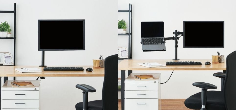 ラクな姿勢で作業が可能!狭いデスクも広々使用できるモニターアームをリニューアルして新発売