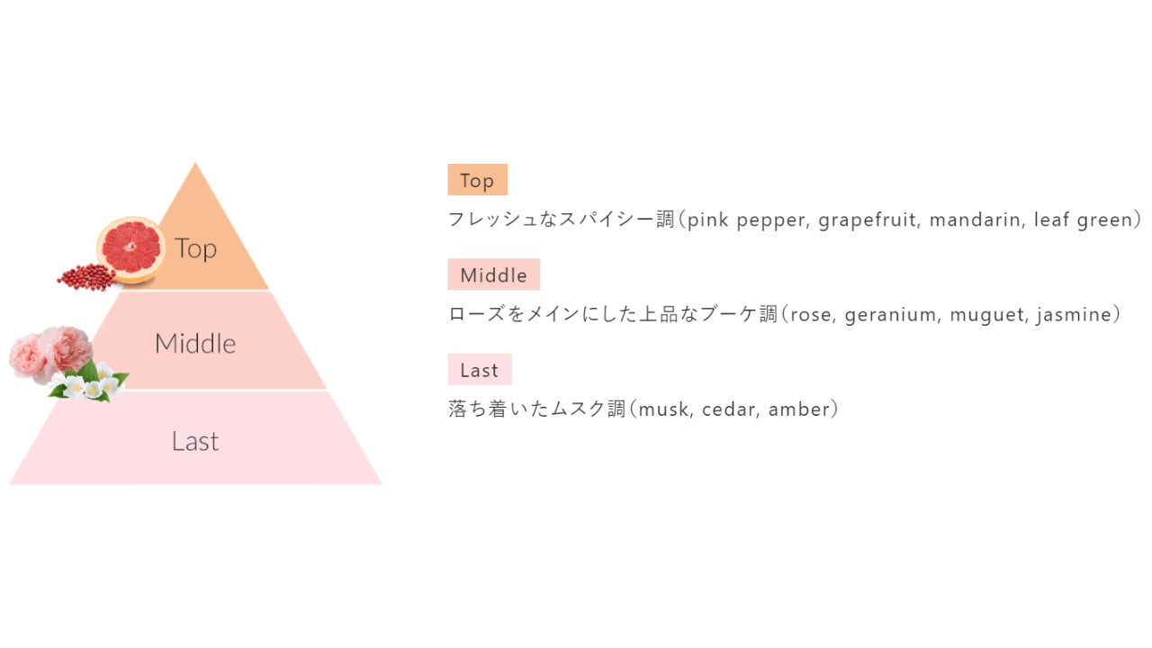 フレッシュ&スパイシーな幕開けから花々のブーケが展開し、ムスクのやわらかな余韻へ。