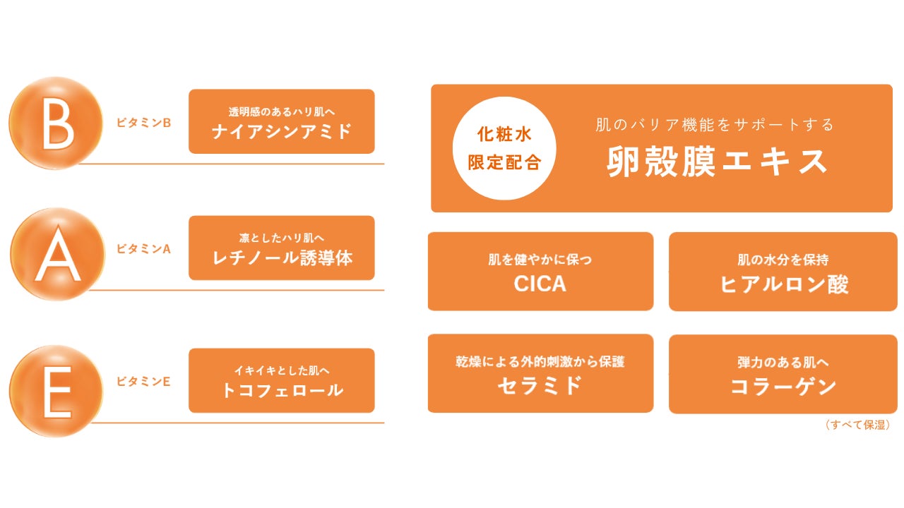 MEDI SHOT高濃度美容シリーズ共通成分のビタミンコンプレックス、美容液分の3種のセラミド3種のヒアルロン酸、3種のコラーゲン、CICA(ツボクサエキス)、ローズマリーエキスに加え化粧水には注目成分の卵殻膜エキスを配合。卵殻膜は今注目の成分。