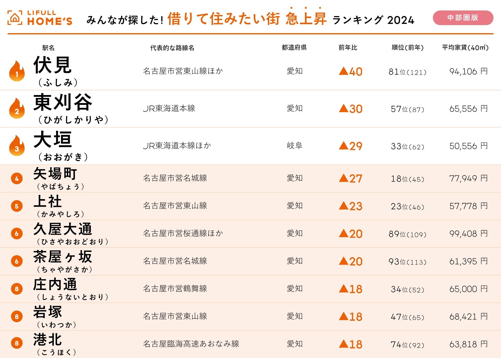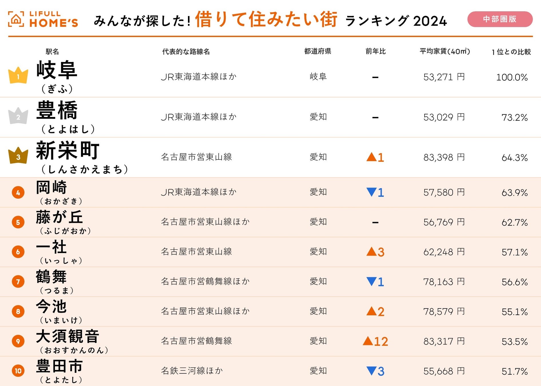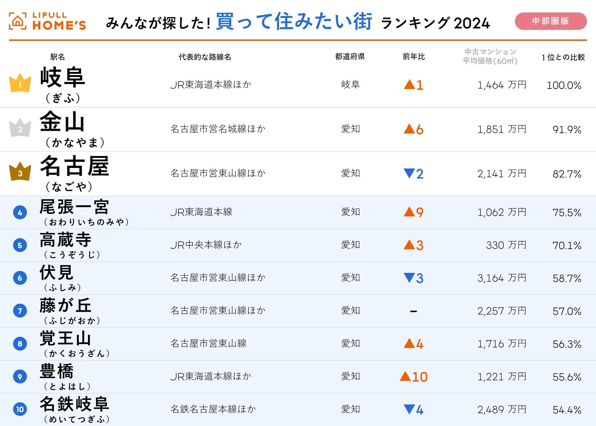 TOP10の顔ぶれは、4位は前回13位から大きく順位を上げた「尾張一宮」、5位「高蔵寺」(前回8位)、6位「伏見」(同3位)、7位「藤が丘」(同7位)、8位「覚王山」(同12位)、9位「豊橋」(同19位)、10位には上記の通り「名鉄岐阜」です。