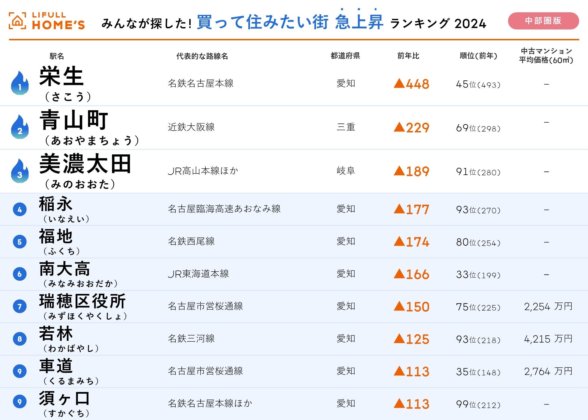 <中部圏版>2024年 LIFULL HOME'Sみんなが探した!住みたい街ランキング