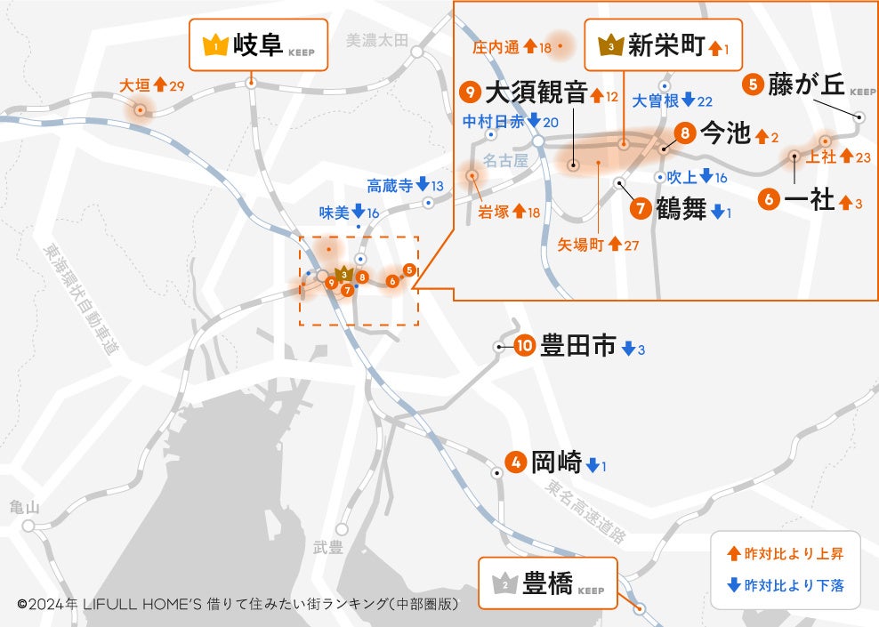 「岐阜」が6年連続の1位を堅持!若年層からファミリー層までの支持を獲得、名古屋市内の「新栄町」が上昇し“シン・3強体制”に