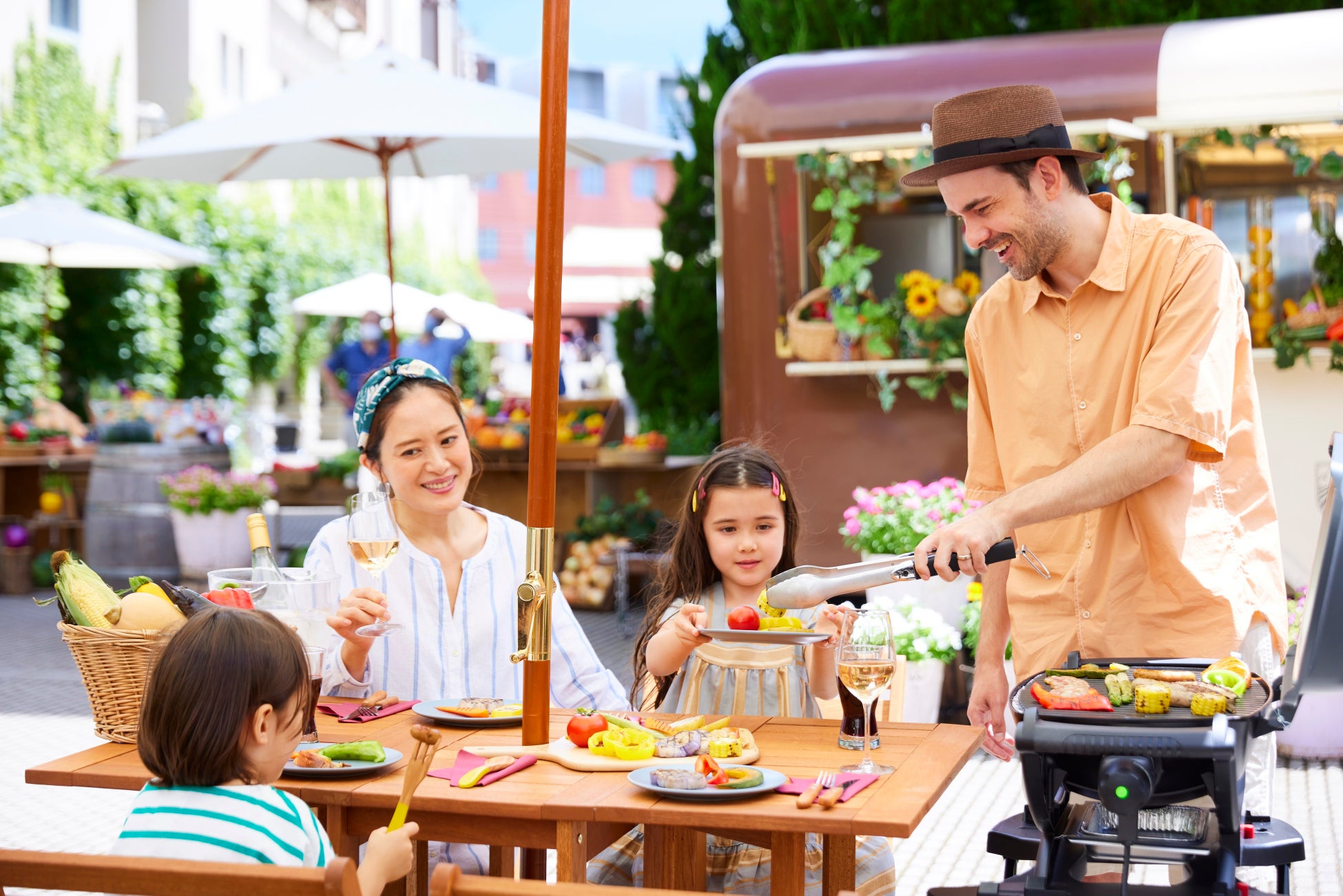 マルシェで買った野菜をその場で焼いて食べられるように、今年もバーベキューエリアを用意します。野菜を加熱して味わうことで、野菜本来の味わいや香りをより感じることができます。また、キッチンカーでは、野菜をカットする手間がなく、すぐに食べられるようにあらかじめカットされた、ズッキーニ、パプリカ、とうもろこしなど10種類の野菜セットも用意。グリル台やトング、カトラリーのレンタルが付いているグリル台セットで、青空の下、バーベキューを楽しめます。ピーマン通りの店舗で買ったソーセージやベーコンと一緒にグリルして食べることもおすすめです。