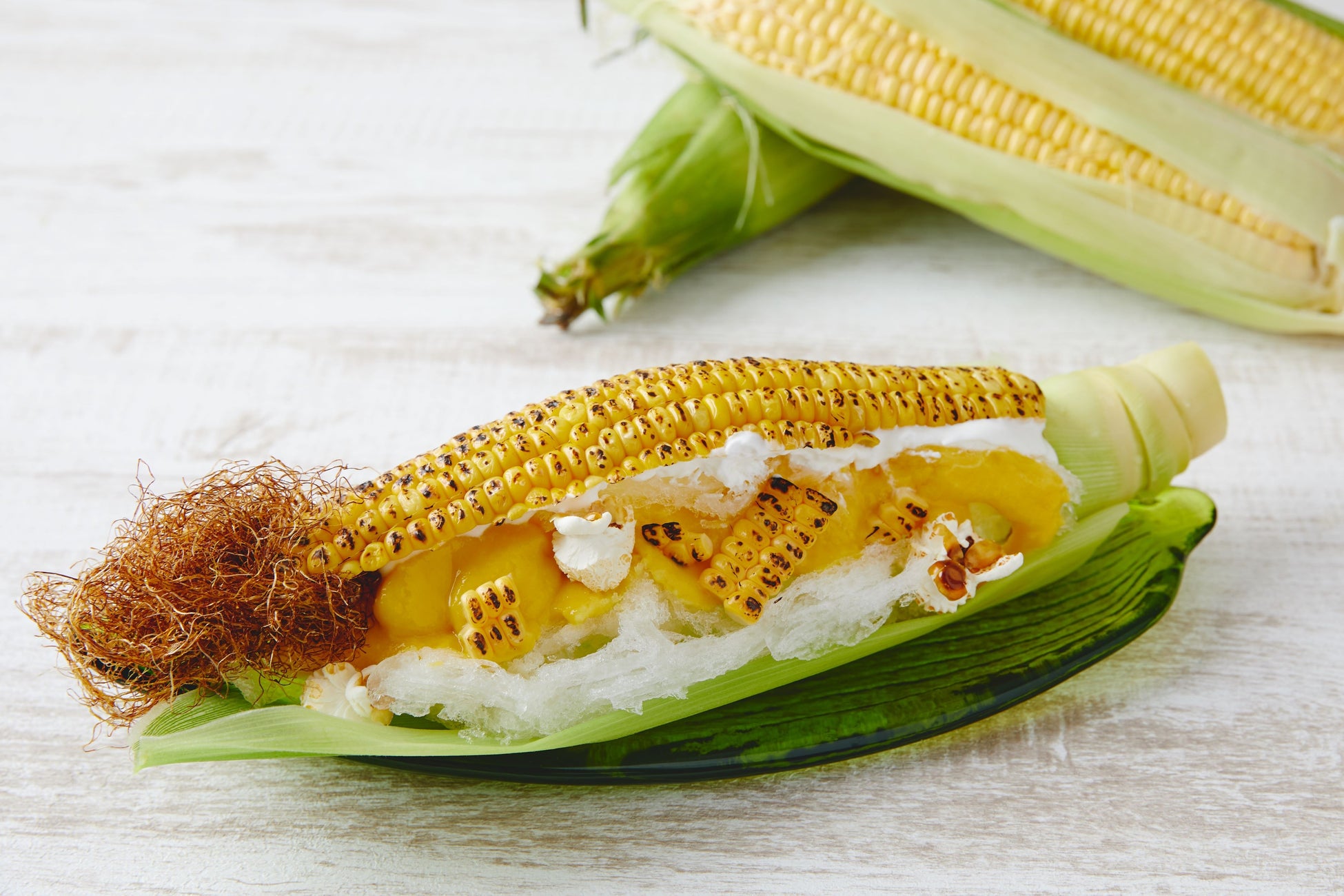 今年で3年目を迎えるリゾナーレ八ヶ岳の夏野菜のかき氷。今年は、とうもろこしを余すところなく丸ごと1本使った「とうもろこしのかき氷」を提供します。一皿の中に本物の皮やひげを使用し、トッピングには、新鮮な生のとうもろこしや、香ばしく炙った焼きとうもろこし、ポップコーンを散りばめ、一口毎に違った味わいが感じられます。ソースは本来は廃棄してしまう芯から甘みや旨味を抽出し仕上げました。見た目の楽しさはもちろん、とうもろこしの濃厚な甘みが特徴的なかき氷です。