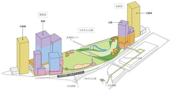 グラングリーン大阪は、約4.5haの面積を誇る都市公園「うめきた公園」を中心に、ホテル、商業施設、イノベーション施設「JAM BASE」など、さまざまな用途施設で構成されたまちとなっています。