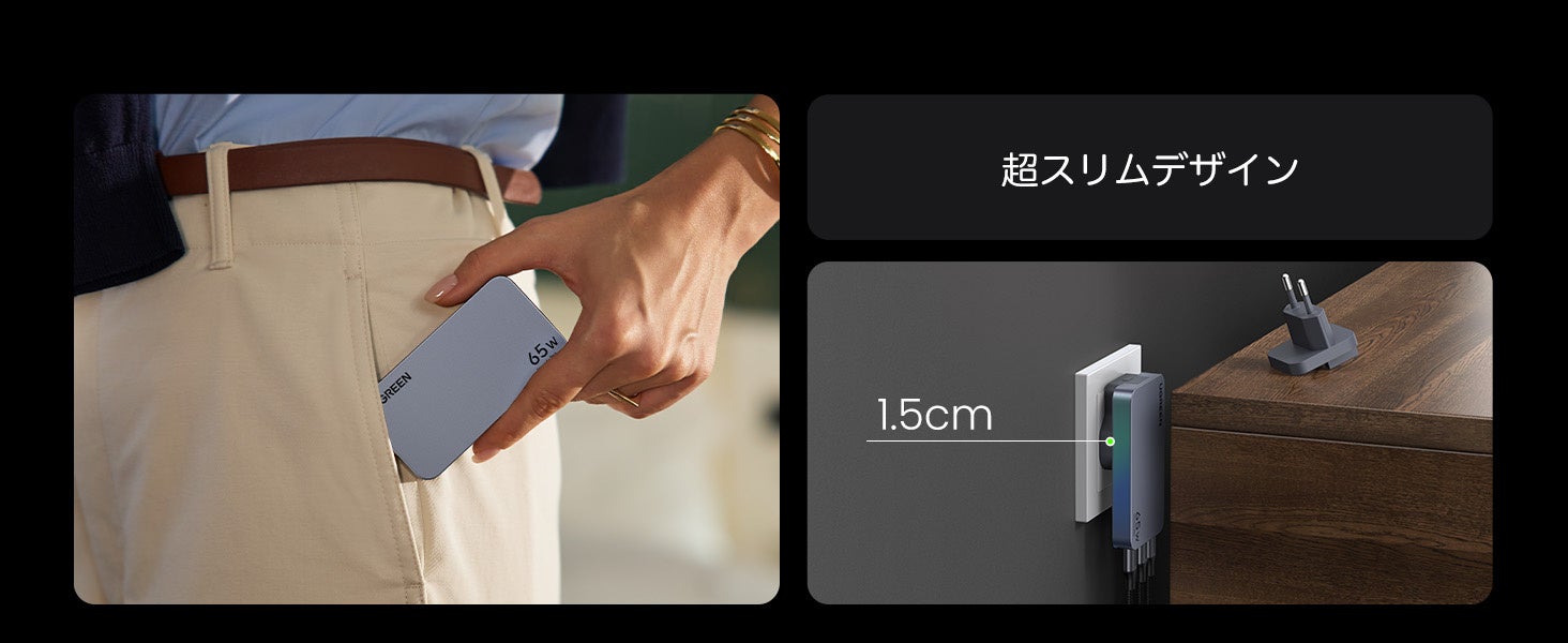 UGREEN Nexode Pro 65W GaN 薄型急速充電器 海外用変換プラグ付き | 手のひらに収まる、超スリムデザイン