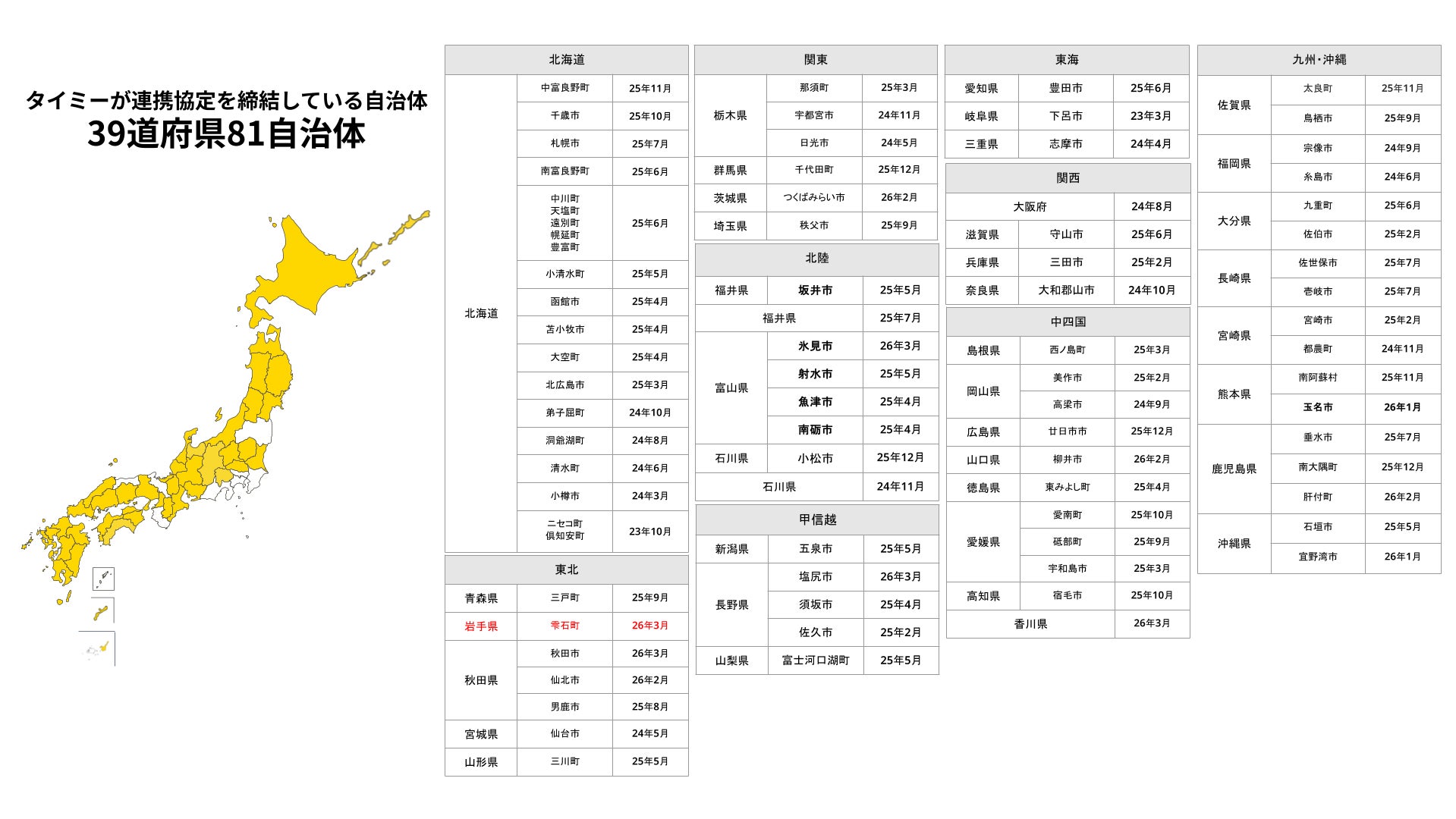 当社はこれまで38道府県・80自治体と連携協定を締結しており、今回の雫石町との連携は39道府県・81自治体目となります(※)。