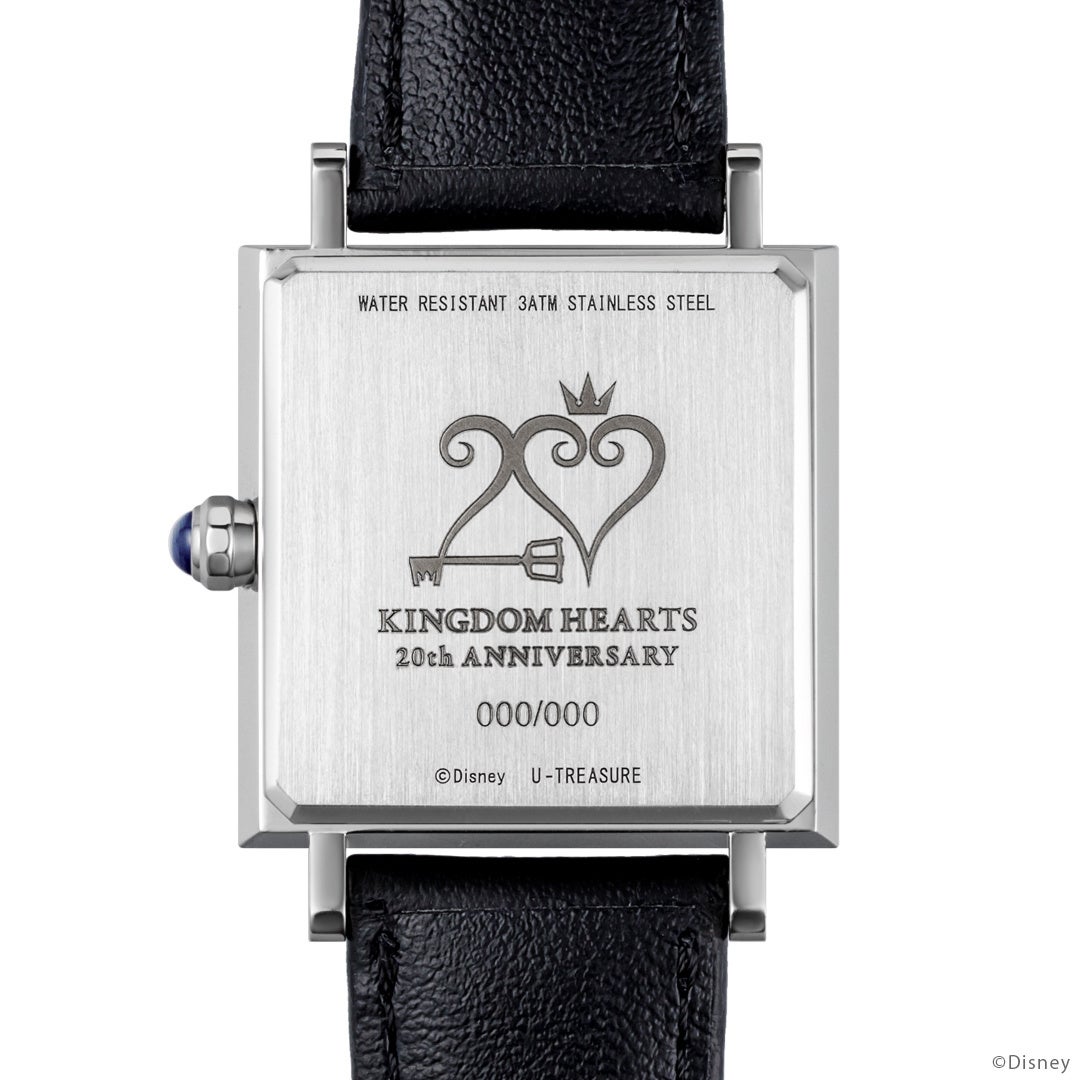 大人のための本格的なキャラクタージュエリーを扱うユートレジャー(東京都豊島区:代表取締役:伊藤 崇史)は、「キングダム ハーツ」シリーズ20周年を記念し、腕時計ブラック&ホワイト2種類を合計200本の数量限定で、7月1日(金)~8月15日(月)の期間に予約受付を行ないます。このたびの新作は、文字盤に「ソラ」が着用しているネックレスの王冠モチーフをデザインしたスクエア型の腕時計です。スモールセコンドの針には「王様」のアイコンをあしらい、裏蓋には「キングダム ハーツ」シリーズ20周年のタイトルロゴとシリアルナンバーを刻みます。クオリティにこだわったメイドインジャパン製のスクエアケース、リューズにはブルーサファイア、革ベルトを採用しています。ユートレジャーコンセプトストア池袋、ユートレジャーオンラインショップにて取り扱います。