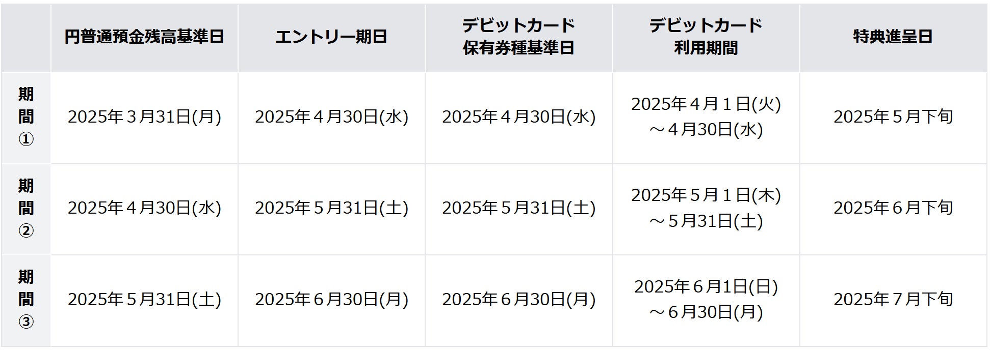 > 3ヵ月連続!月末円普通預金残高200万円以上で翌月の対象デビットカードポイント還元率アップキャンペーン