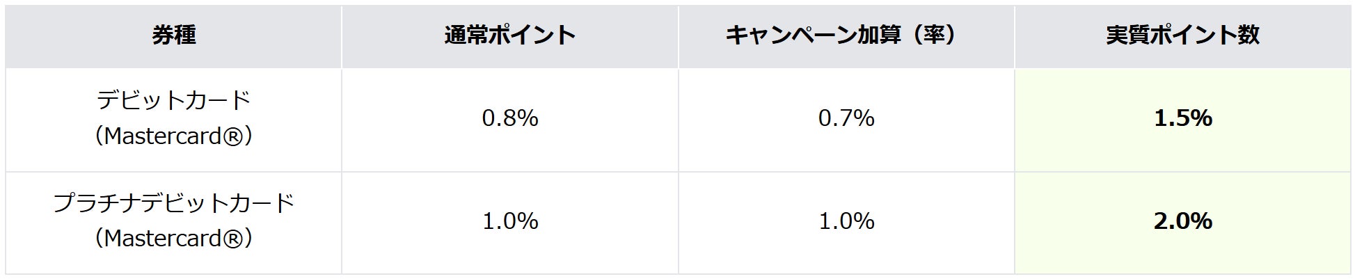 キャンペーン加算(率)は、各期間「デビットカード保有券種基準日」時点で保有していた券種の率を適用します。